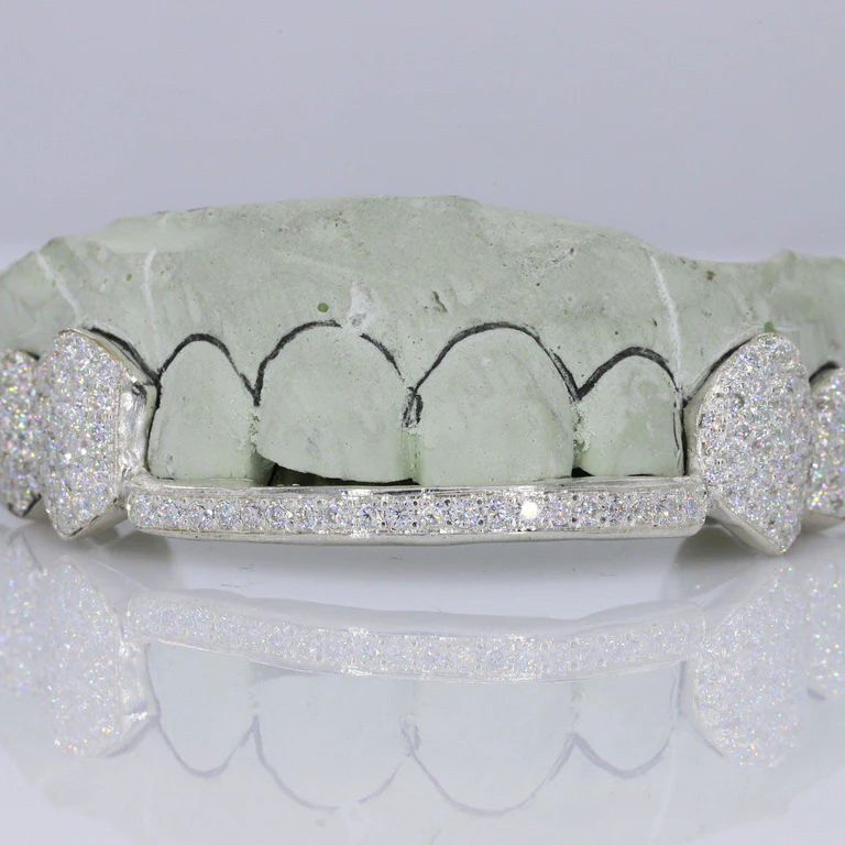 Grillz Personalizados Virani Enterprise Modelo 11, 8 Piezas, Diseño Abierto, Barra de Diamantes Moissanite (Plata/10K/14K), 60g, Unisex, Claridad VVS