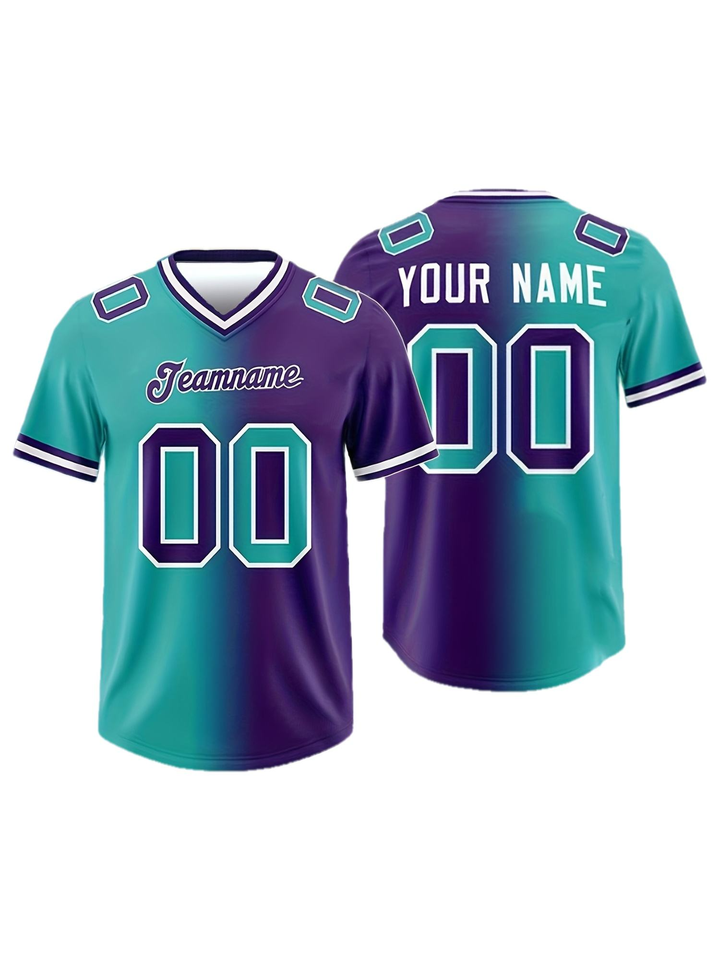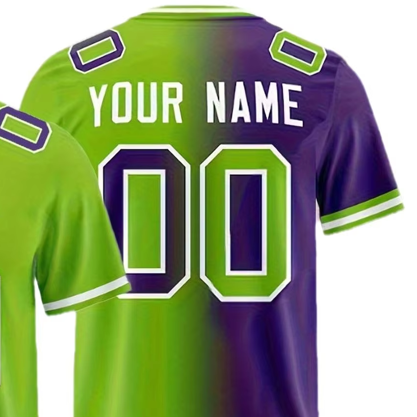 Camiseta de fútbol americano de talla grande de manga corta personalizada medio verde medio morado con nombre y número de equipo personalizados