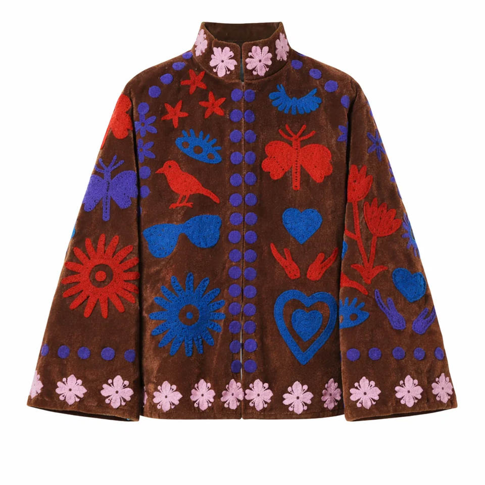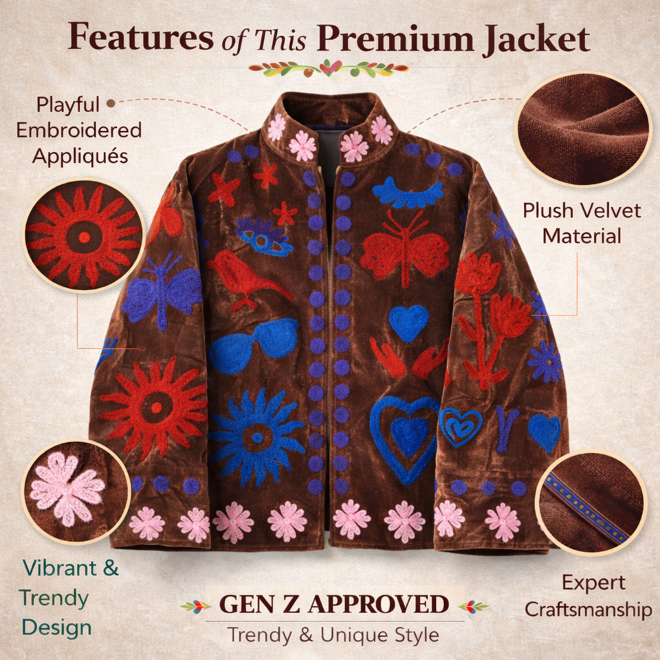 Chaqueta Bomber de Terciopelo Bordada a Mano Personalizada para Mujer, Chaqueta de Boutique con Cuello Alto y Diseño Floral Suzani