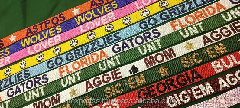 Correa de bolso con cuentas hecha a mano personalizada correa de bolso bordada al por mayor correa de hombro con cuentas de semillas de equipo universitario de Gameday personalizada