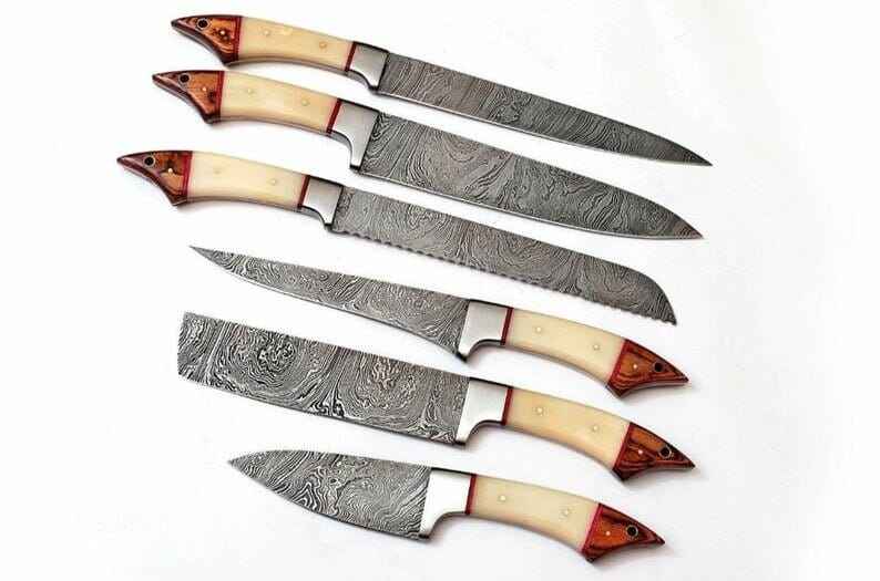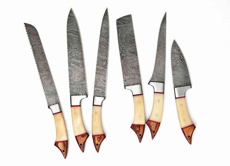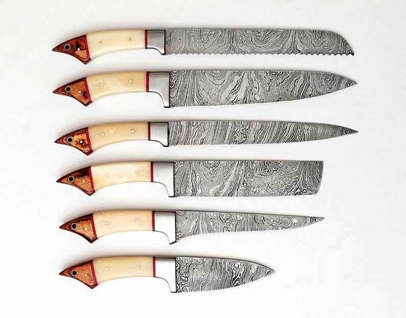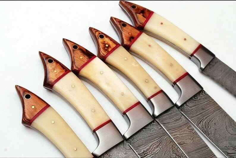 Juego de Cuchillos de Chef Damasco Hechos a Mano, Juego de 6 Cuchillos de Cocina con Mango de Hueso de Camello y Madera Pakka