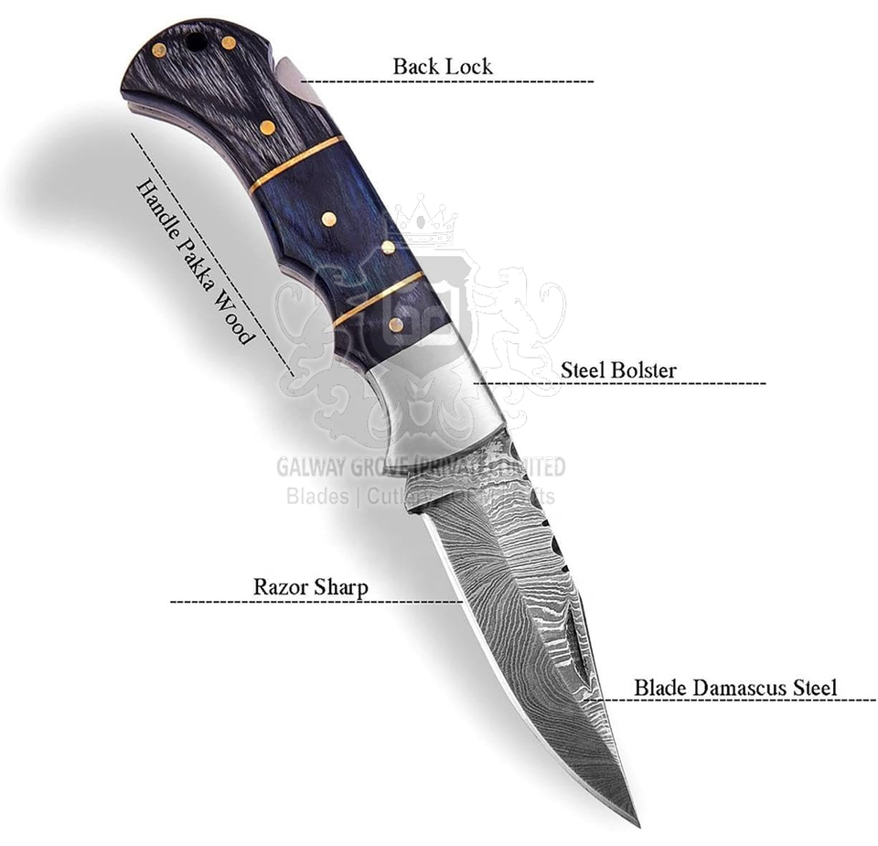 Navaja de Bolsillo Hecha a Mano con Acero de Damasco, Punta de Caída, Bloqueo Trasero, Mango de Madera, EDC, Afilada, Grado Industrial, Garantía de 3 Años, OEM