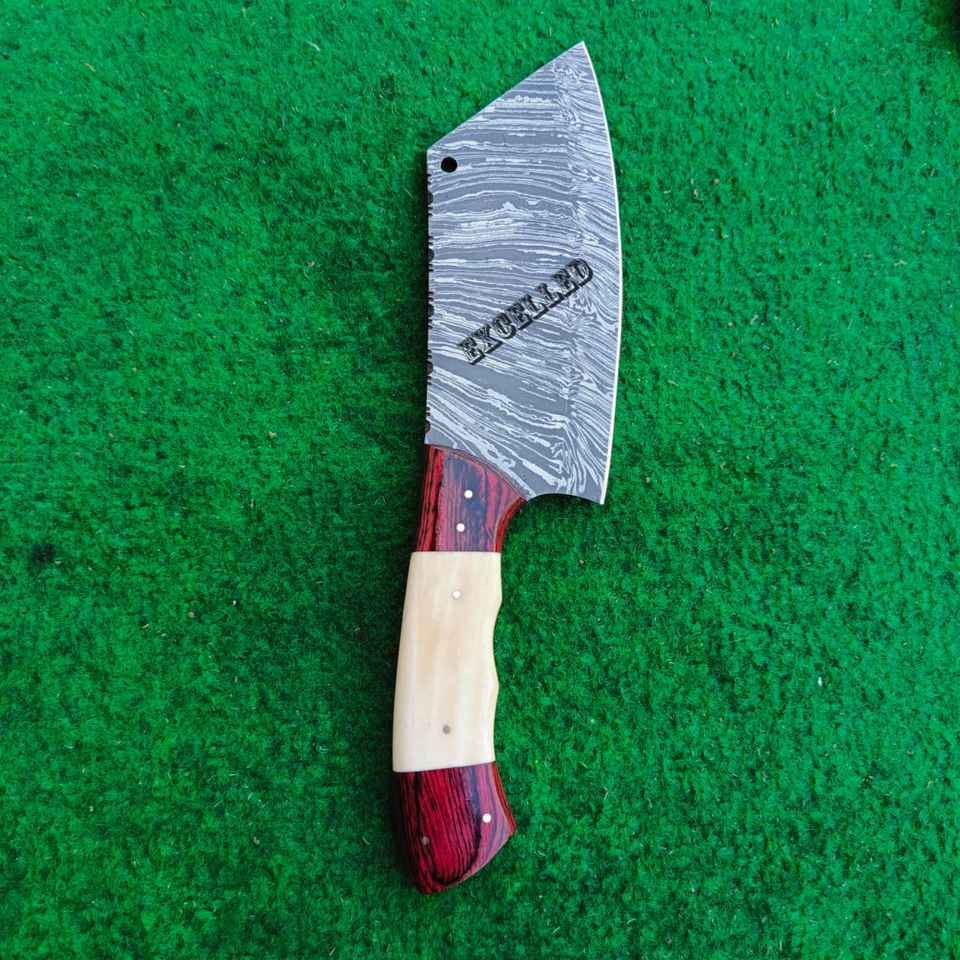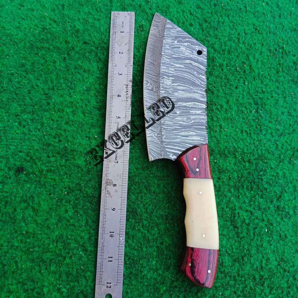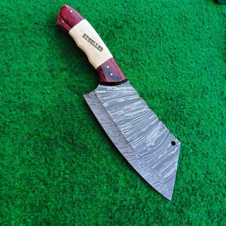 Cuchillo de carnicero de acero de Damasco hecho a mano personalizado con mango de madera y hueso Pakka, cuchillo de carnicero de cocina en estilo serbio