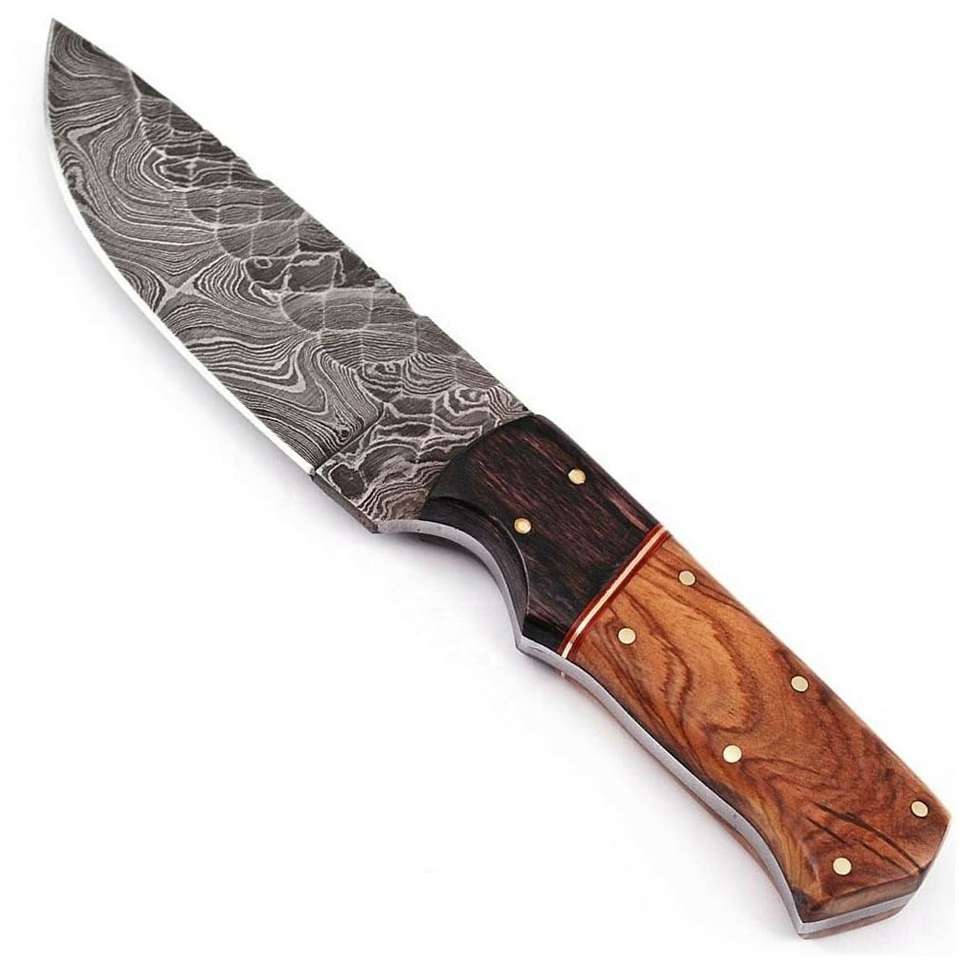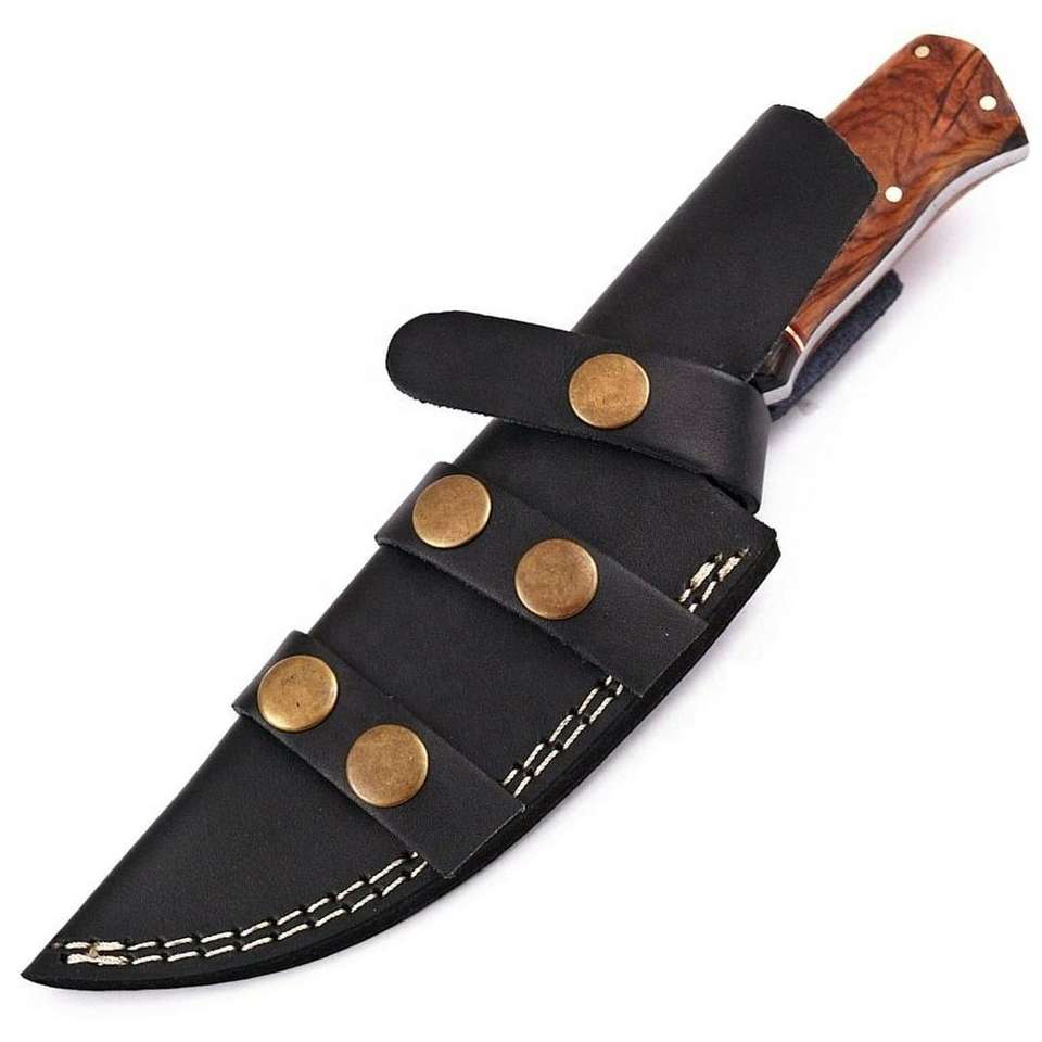 Cuchillo de caza de hoja fija de acero de Damasco hecho a mano OEM personalizado, forjado, con punta caída, para camping y desollado, con mango de madera y funda de cuero.
