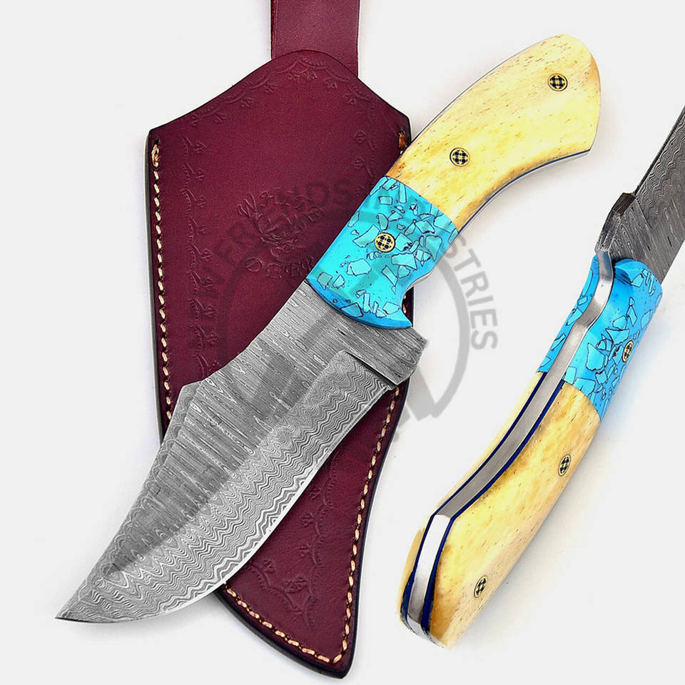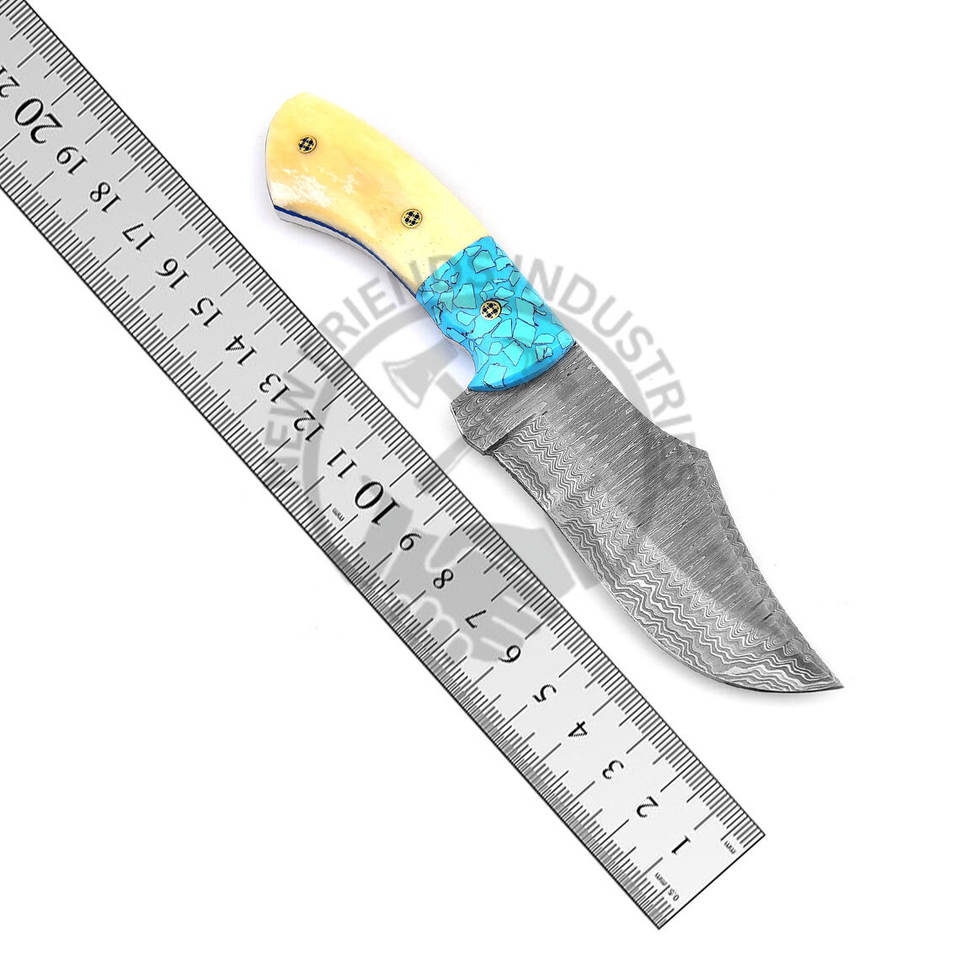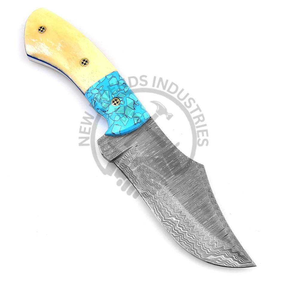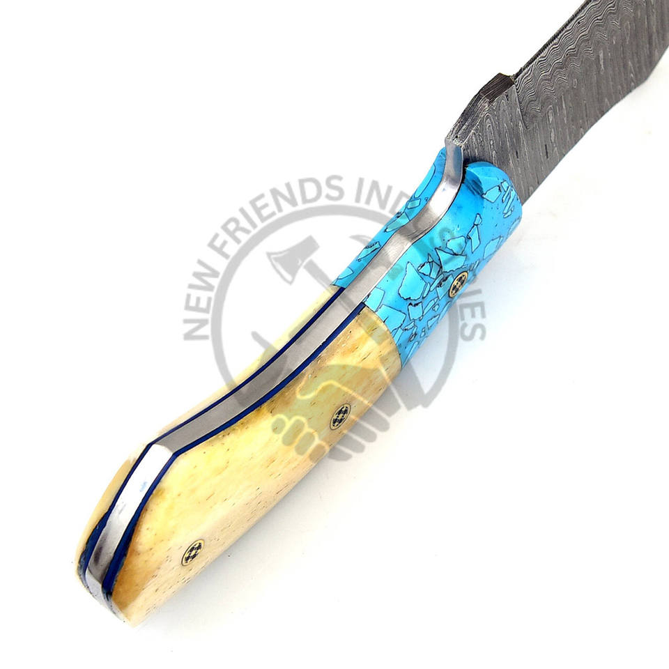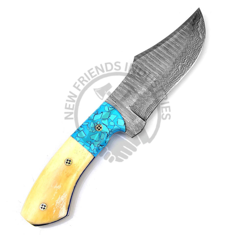 Cuchillo de Acero de Damasco Hecho a Mano Personalizado para Caza Táctica al Aire Libre, Cuchillo de Cazador de Bisones, Mango de Piedra Azul/Hueso de Camello Blanco para Bricolaje