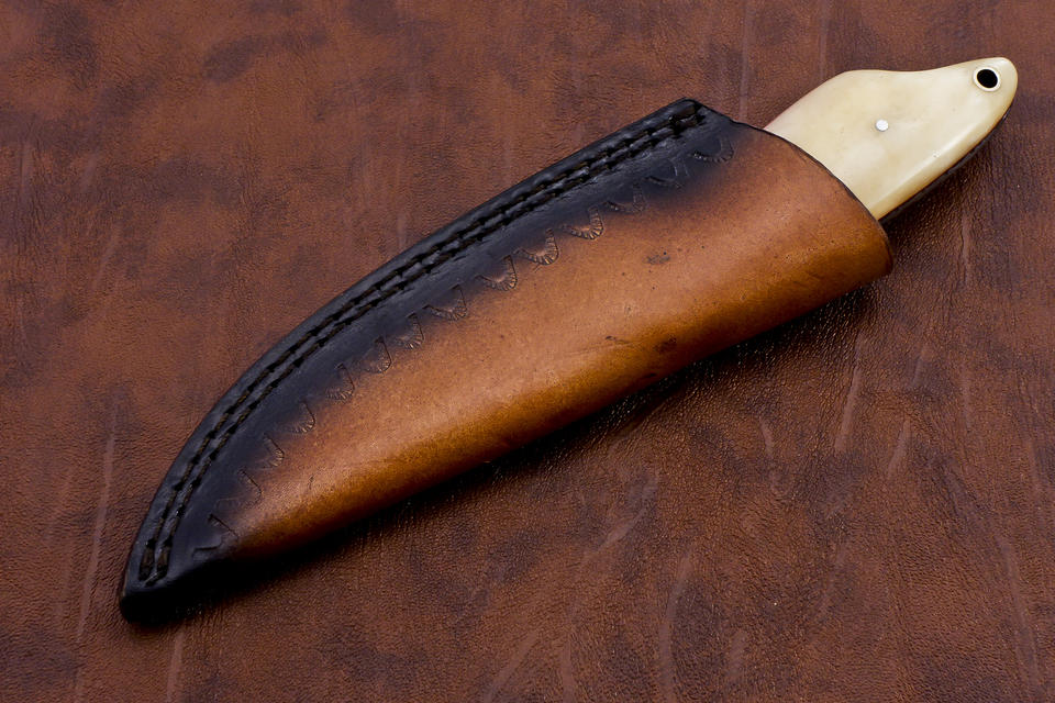 Cuchillo desollador de acero de Damasco hecho a mano personalizado con mango de hueso de camello hermosa Funda de cuero grado EDC compatible con OEM