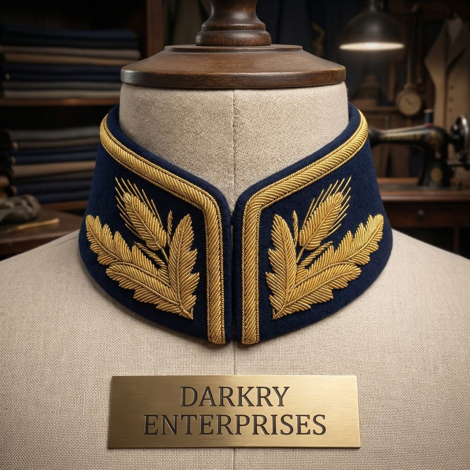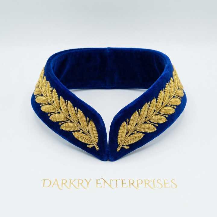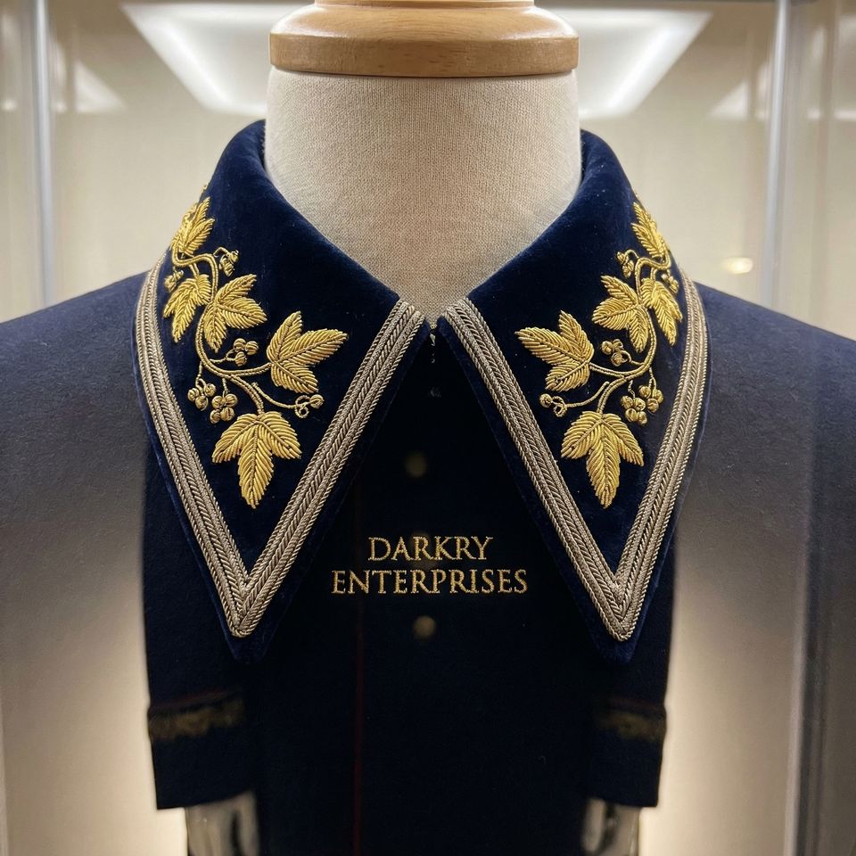 Servicio de Fabricación de Cuellos de Terciopelo Azul Real con Bordado de Hilo de Oro Hecho a Mano y Diseño de Hojas