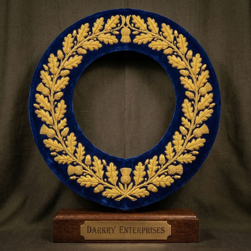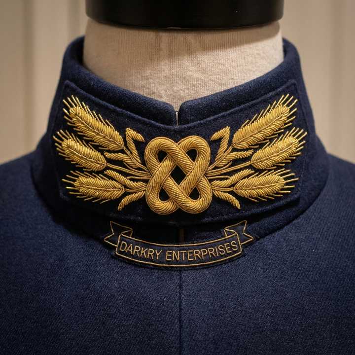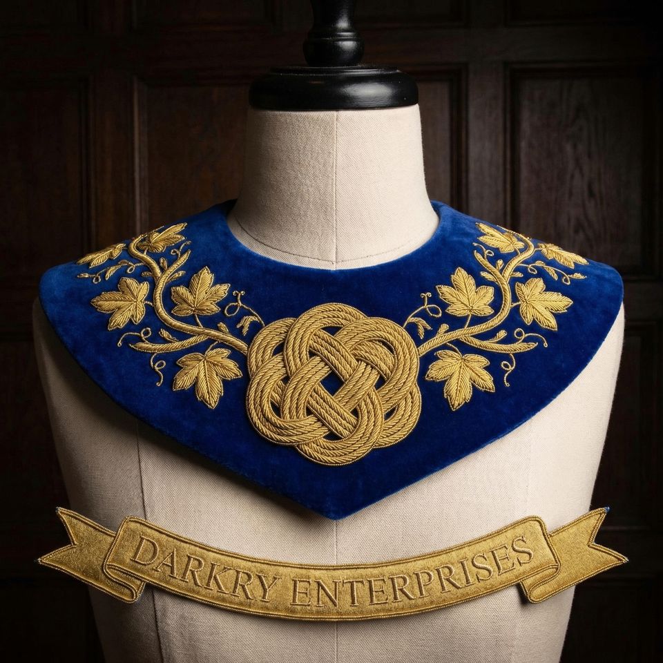 Servicio de Fabricación de Cuellos de Solapa Bordados a Mano con Hilo de Oro, Diseño de Nudo de Trigo en Azul Oscuro