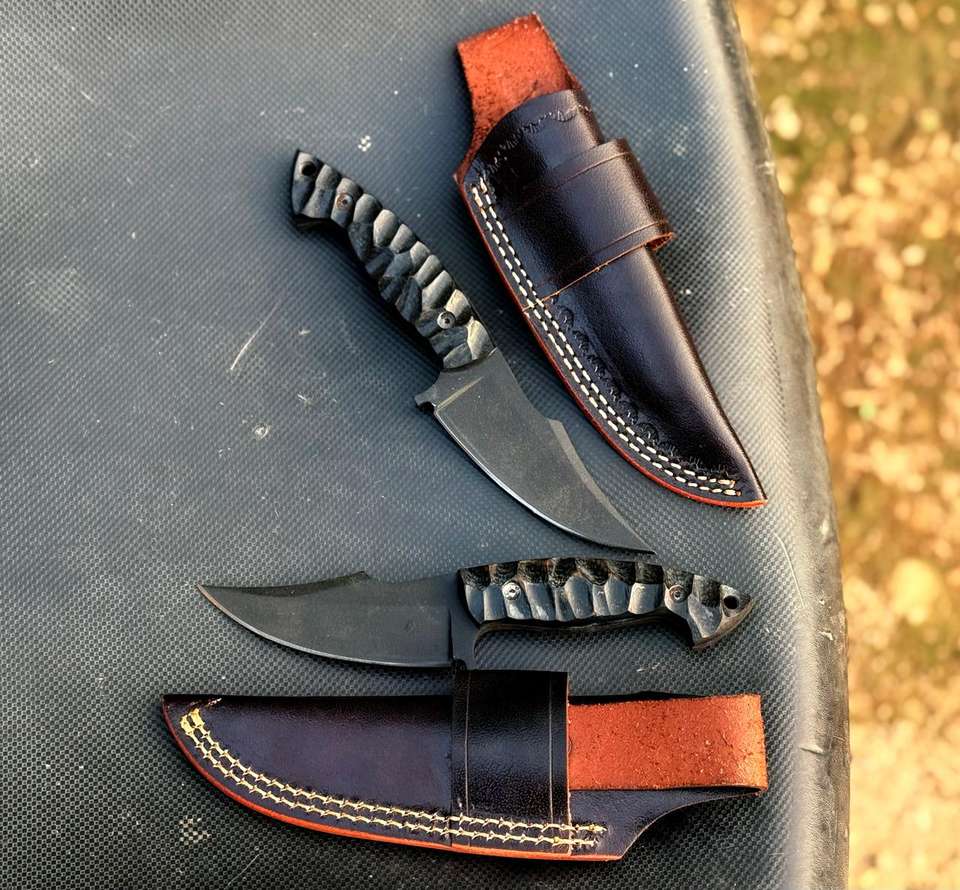 Cuchillo de desollar hecho a mano personalizado, hoja de acero D2 con recubrimiento de polvo negro, cuchillo de caza con mango de micarta y funda de cuero.