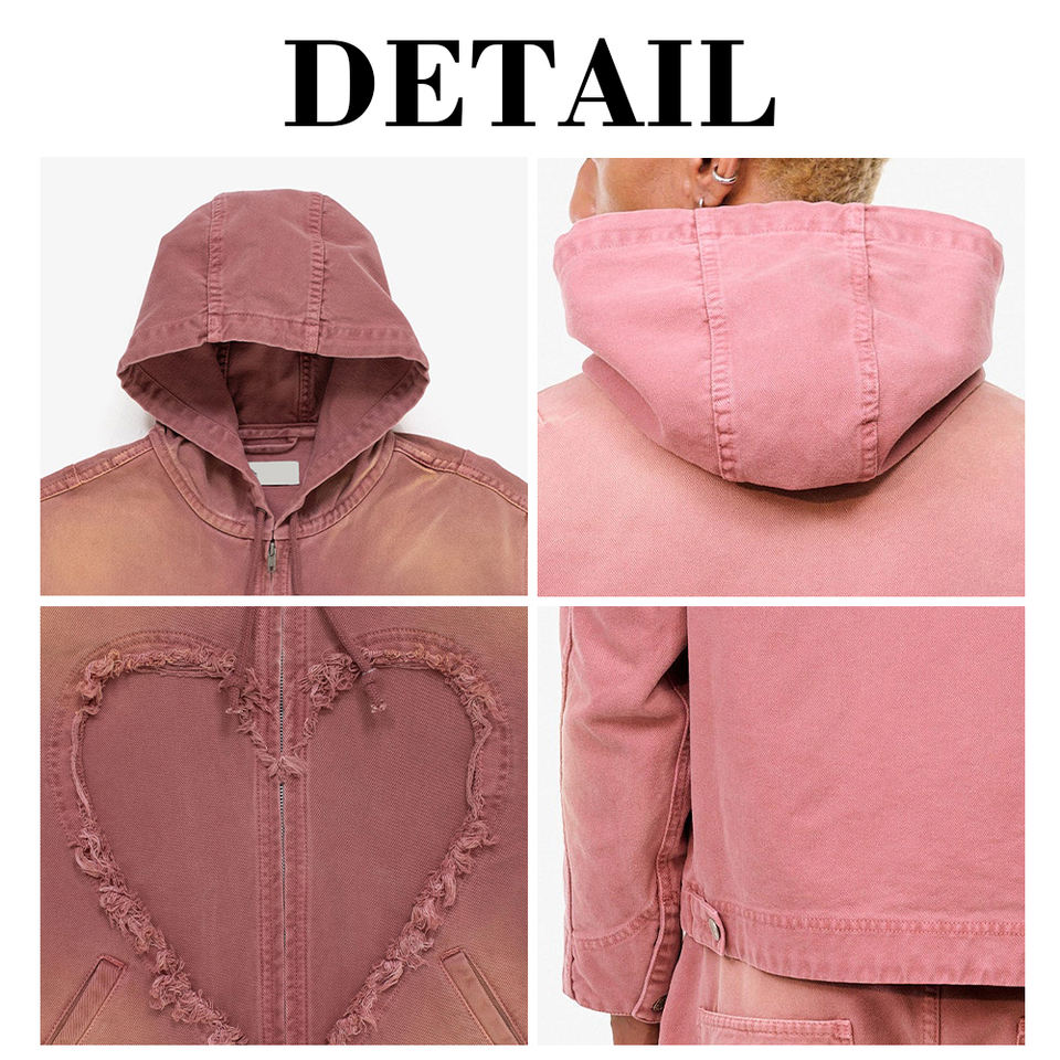 Chaqueta con capucha vintage lavada con parches de corazón personalizados para hombre, abrigo exterior con cremallera y diseño de corazón deshilachado, venta al por mayor de fábrica