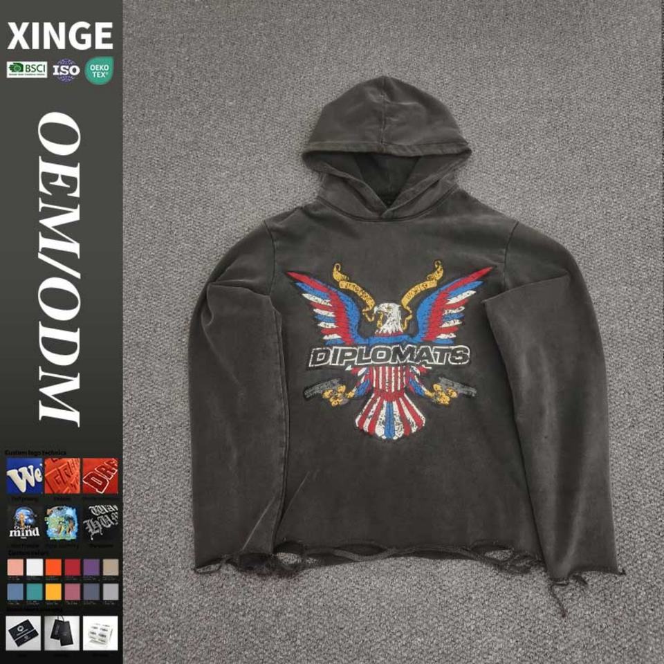Sudadera con Capucha Personalizada de 500 g/m², Lavada al Ácido, con Diseño Gráfico Digital Urbano, Hombros Caídos, Corte Holgado y Cuadrado para Hombre