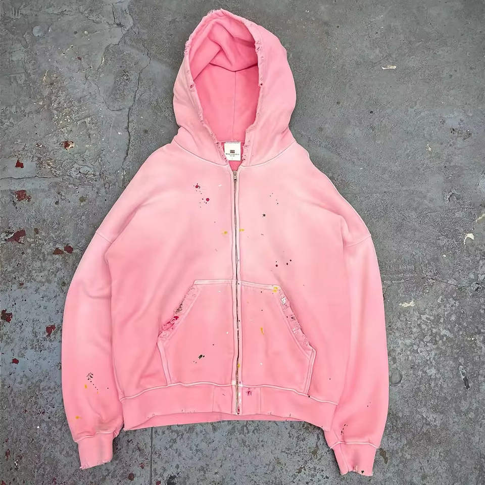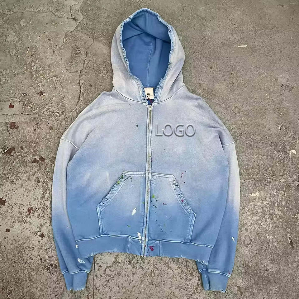 Sudadera con Capucha Extra Grande de Estilo Desgastado con Lavado Ácido Personalizada, Sudadera con Capucha para Hombre con Efecto Desgastado y Decoración de Cremallera