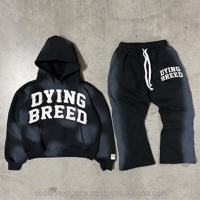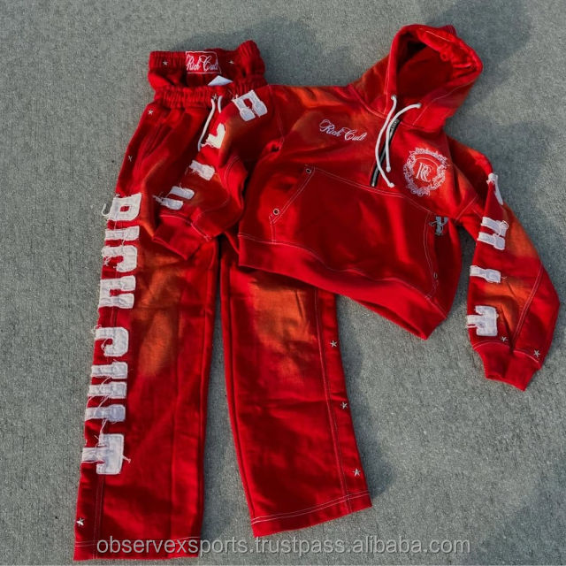 Conjunto de pantalones de chándal y Sudadera con capucha desgastados con diamantes de imitación bordados con serigrafía de lavado ácido de gran tamaño y peso pesado personalizado