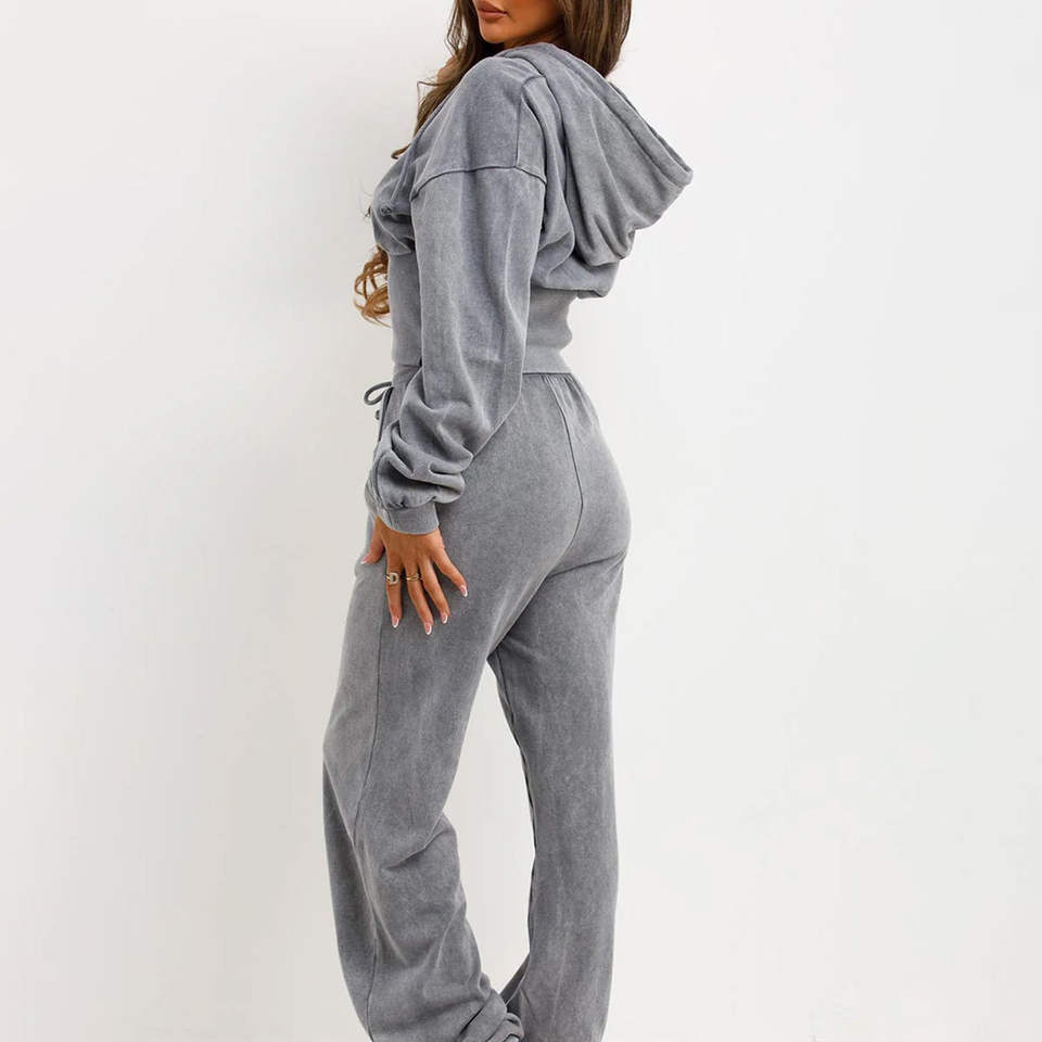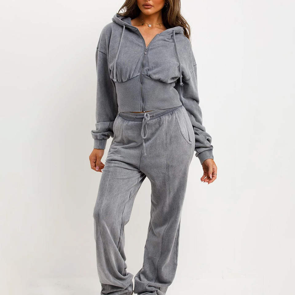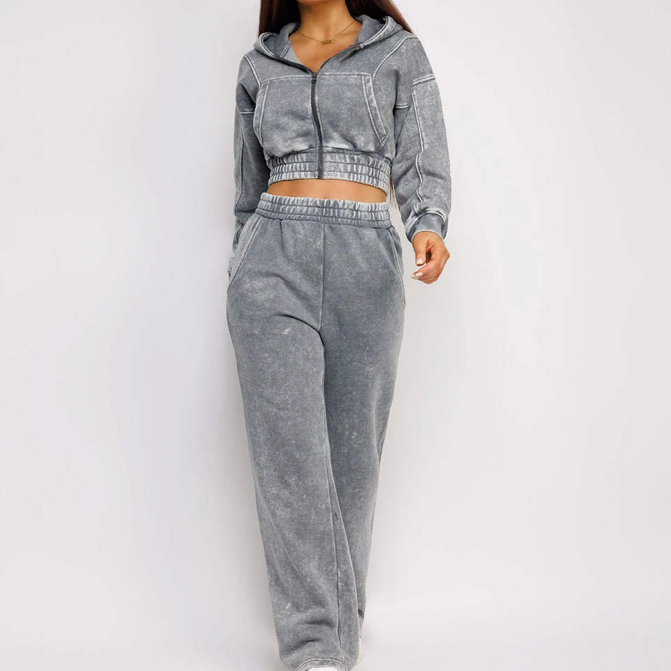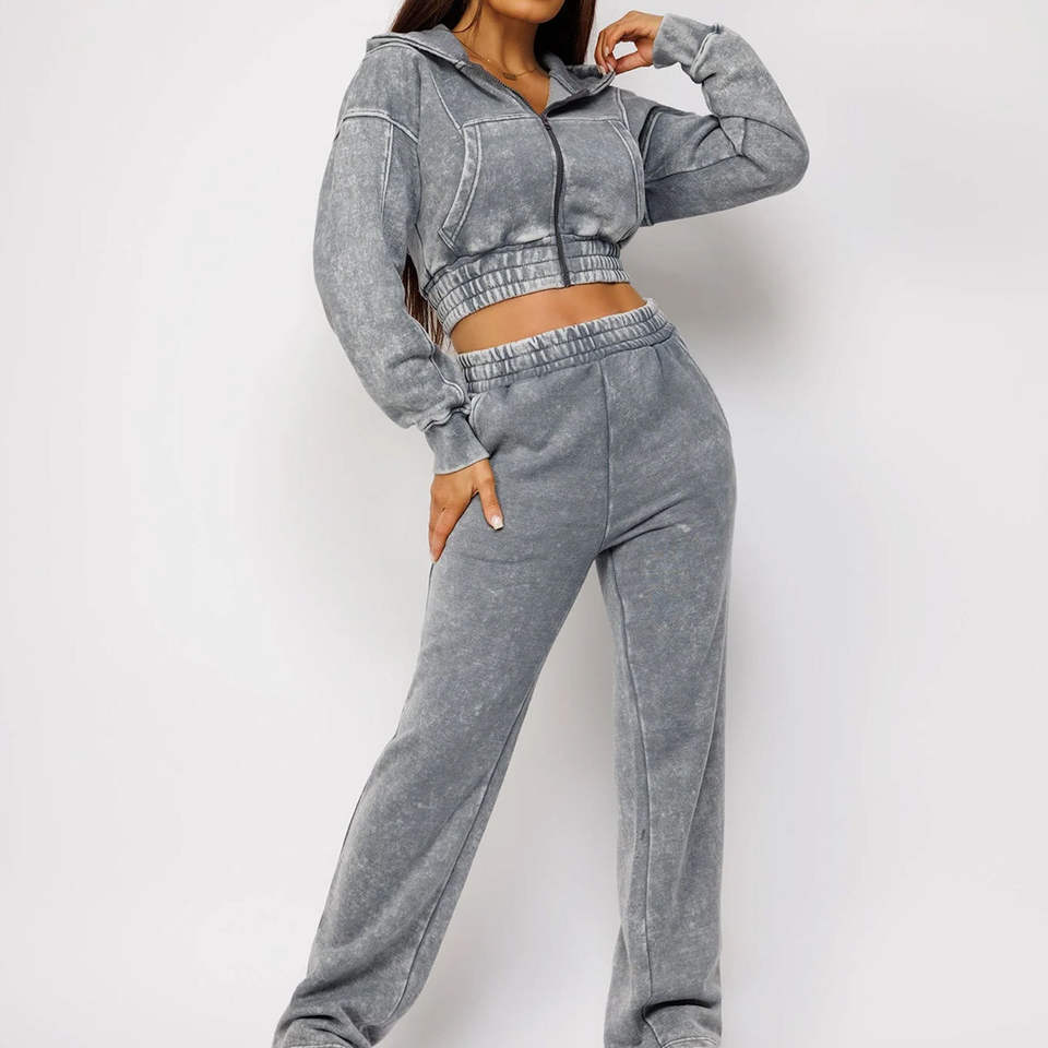 Conjunto de Sudadera con Capucha Corta Distressed de Gran Gramaje Personalizado y Pantalones Acampanados de Chándal para Mujer con Pedrería y Lavado Ácido