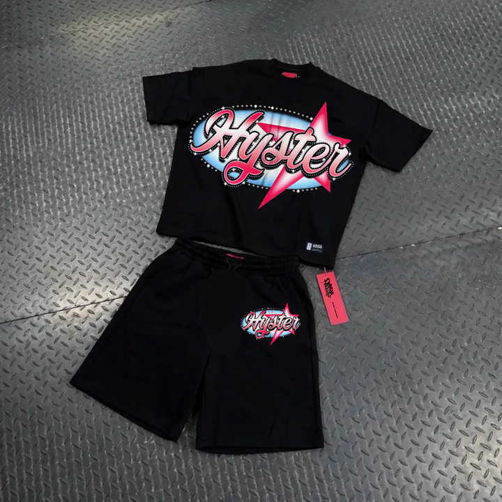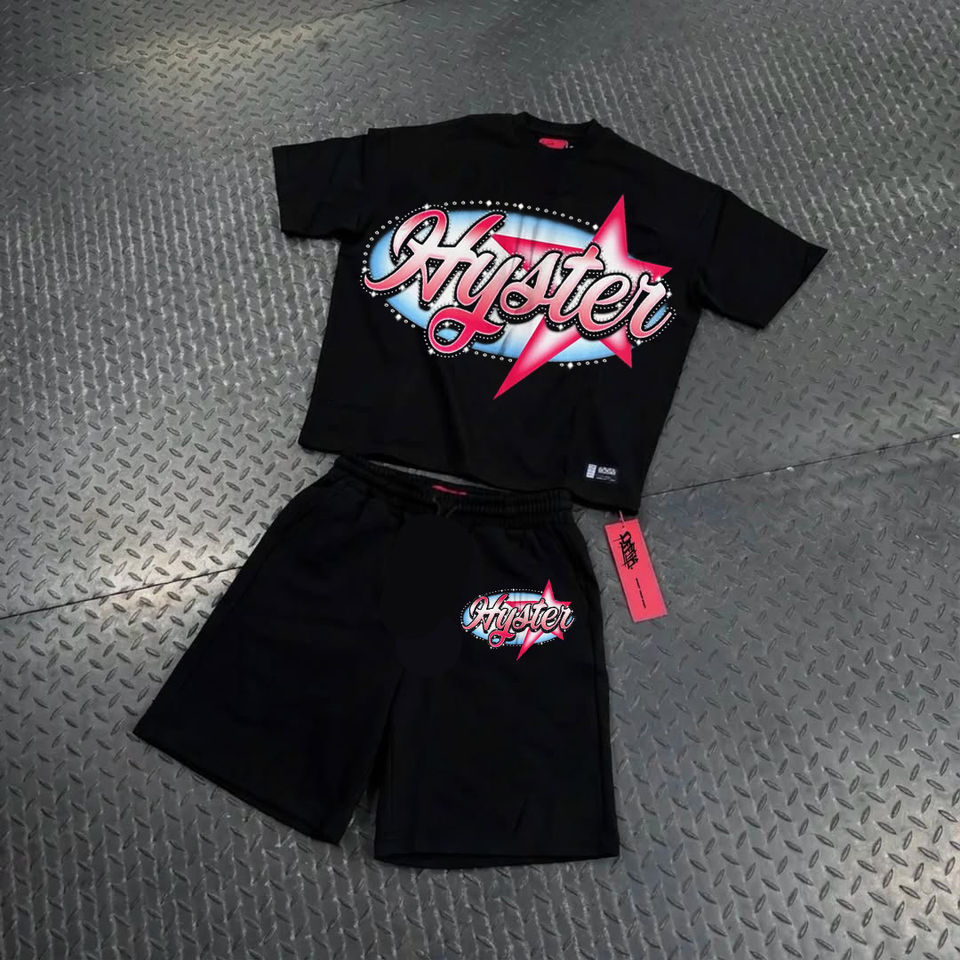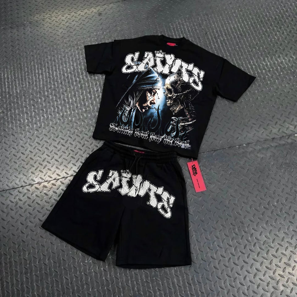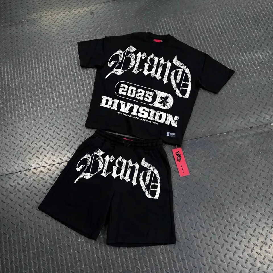 Conjunto de Camiseta y Pantalones Cortos Unisex de Estilo Urbano con Pedrería y Estampado DTG, Color Negro Lavado, Personalizado y de Alta Calidad para Hombre