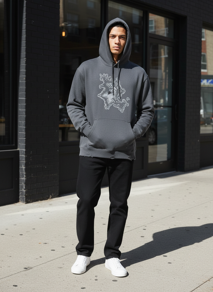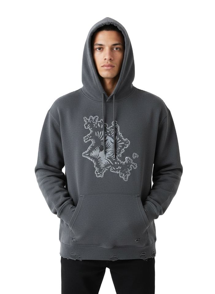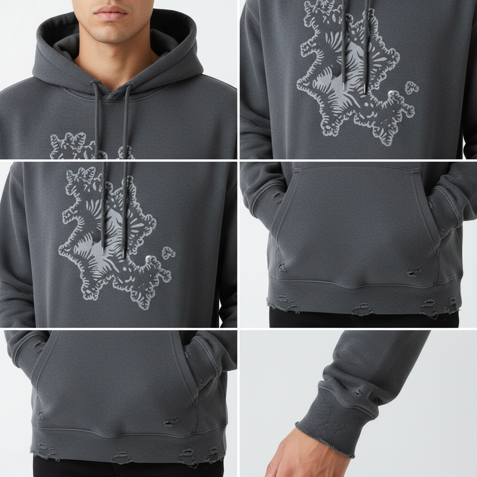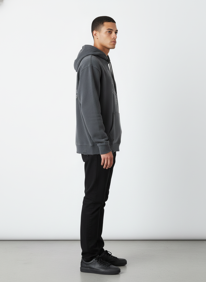 Sudadera con capucha personalizada de algodón de alto gramaje, lavada y desgastada, de corte oversize y holgado, con dobladillo sin rematar, bordada, estilo streetwear y hip-hop