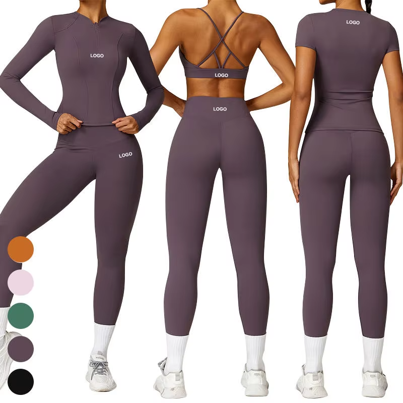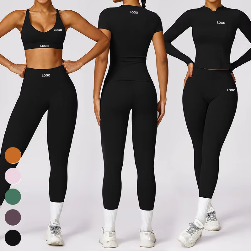 Conjuntos de Yoga de 3 Piezas de Alta Calidad Personalizados, Cintura Elástica Sólida, Ropa Deportiva Sostenible, Sin Costuras, Acanalados