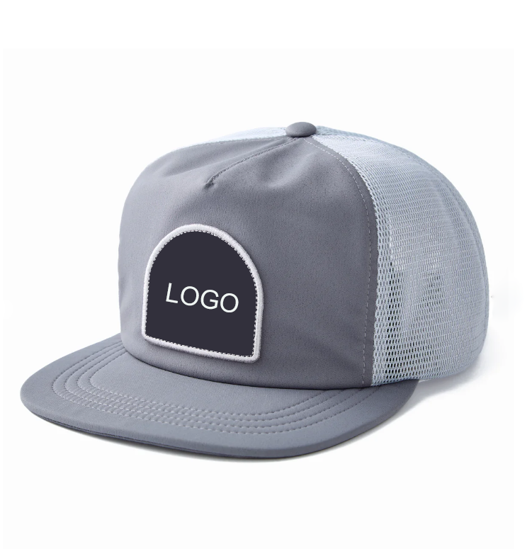Personalizado de alta calidad de 5 paneles de algodón plano Bill estructurado cierre de plástico con parche tejido Logo gorra de camionero hombres gorras de malla