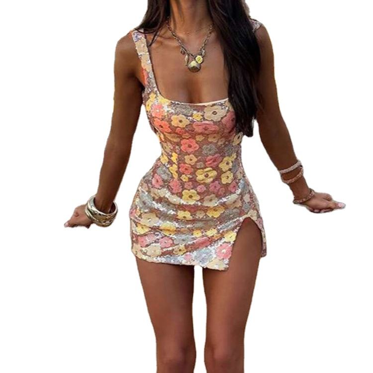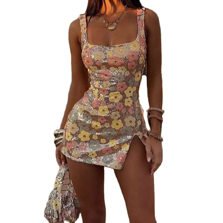 Vestido Mini Casual Elegante de Primavera/Verano, Personalizado, de Alta Calidad, Sin Mangas, con Tirantes Finos, Estampado Floral con Lentejuelas, para Vacaciones