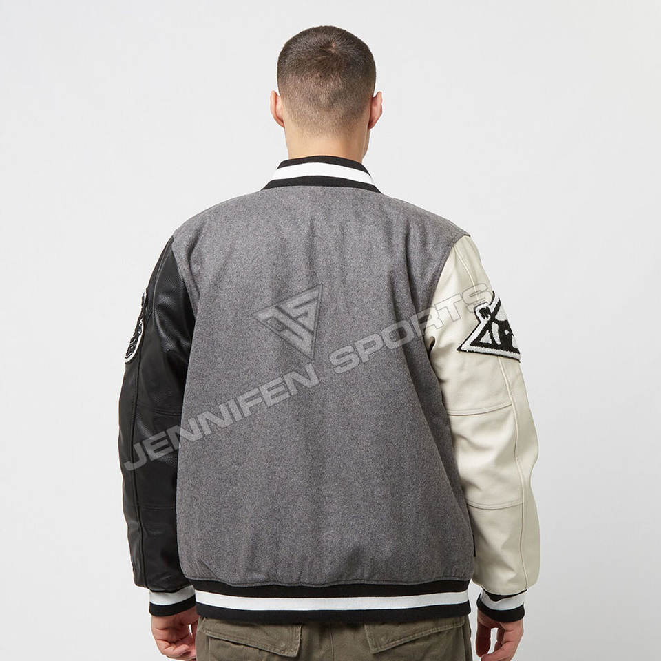Parches bordados de chenilla personalizados de alta calidad, chaqueta universitaria, lana de concha, Mangas de cuero, cierre de botón, forro interior