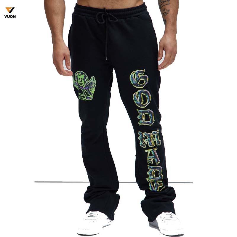 Pantalones de chándal gráficos con logotipo bordado de alta calidad personalizados, diseño de pierna ancha, correas personalizadas, pantalones de chándal acampanados de nailon de gran tamaño