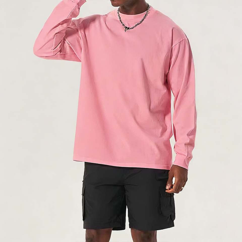 Camiseta de Manga Larga Personalizada de Alta Calidad para Hombre, Corte Holgado con Hombros Caídos, Cuello Acanalado, Color Rosa Moderno