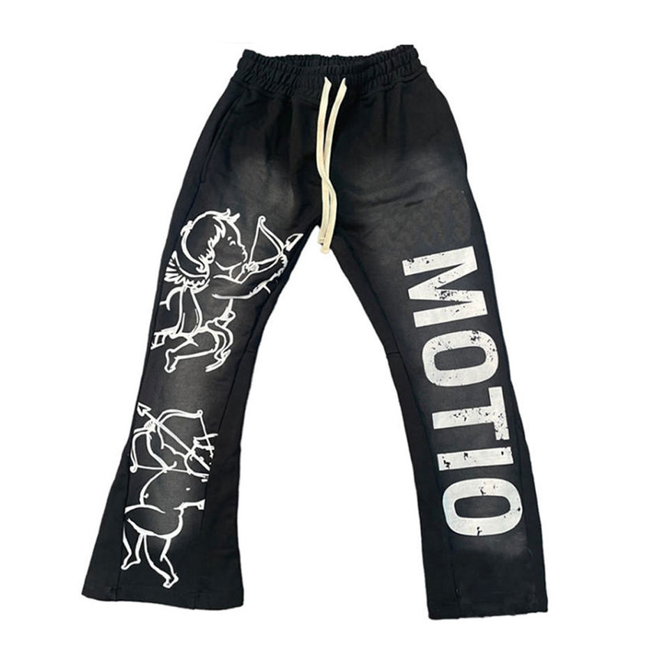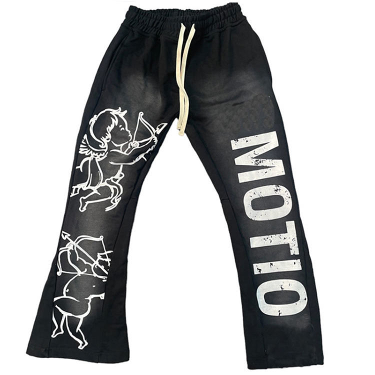 Pantalones de chándal acampanados medios de alta calidad personalizados para hombre, pantalones de chándal informales, cintura elástica con acento de encaje de diamantes de imitación de retazos lavados con ácido