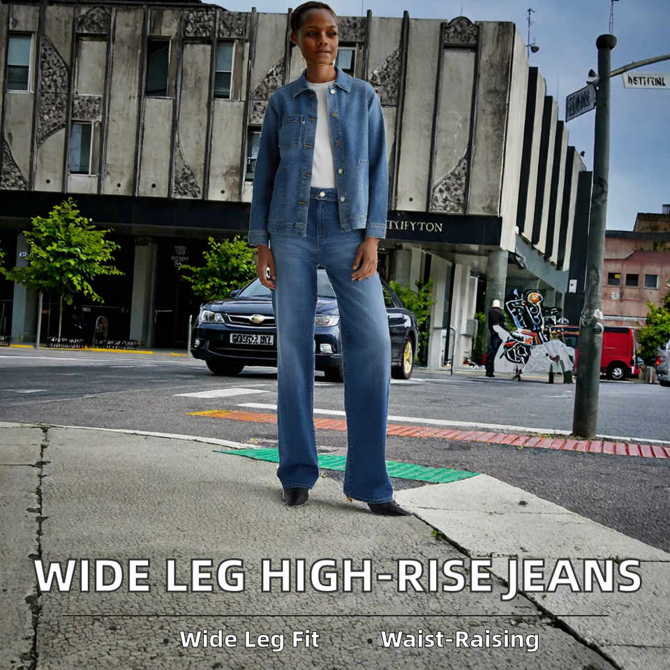 Vaqueros vintage de tiro alto y pierna ancha personalizados para mujer, de mezclilla lavada, ecológicos, de secado rápido, 100% algodón, con bolsillos inclinados y cinturón con anilla en D.