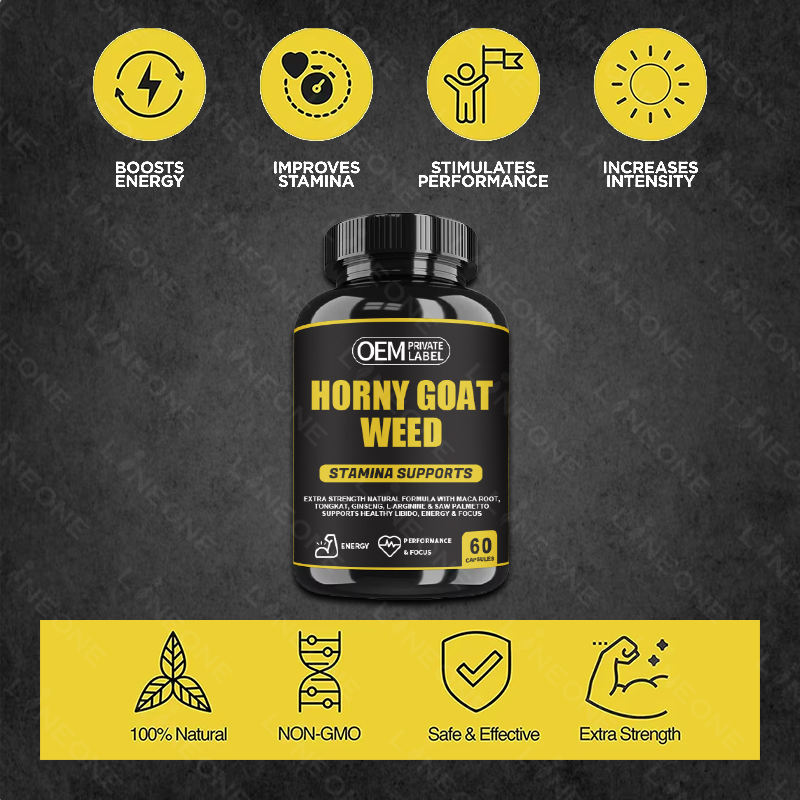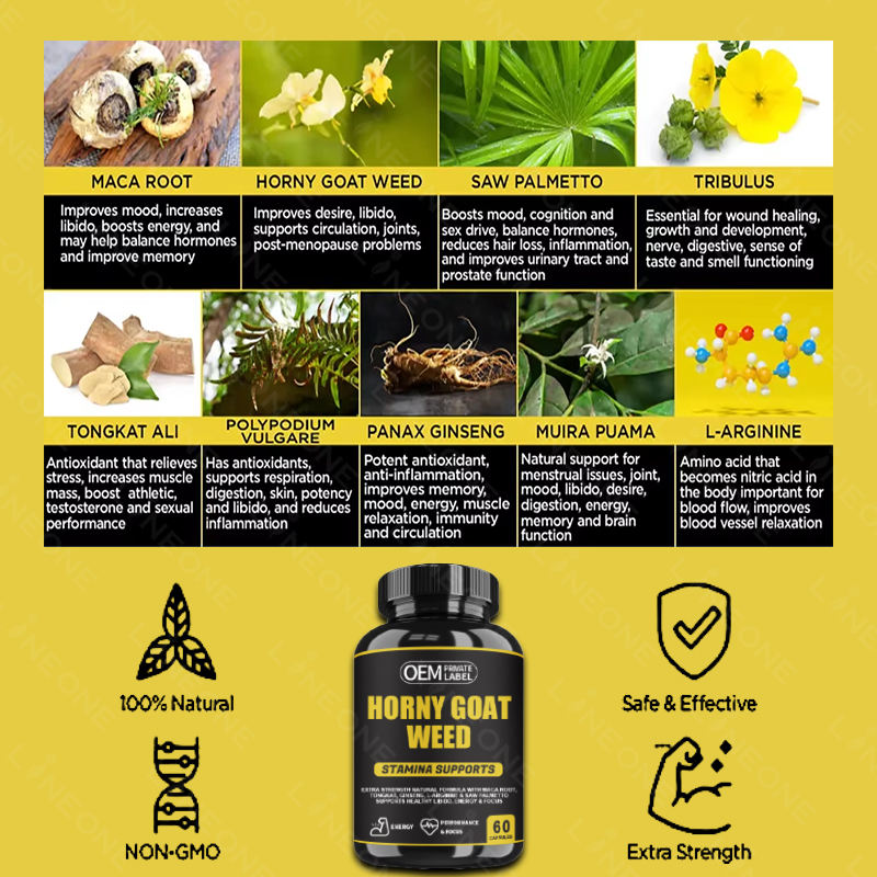 Cápsulas de mezcla complejas de extracto de hierba de cabra caliente personalizadas con extracto de Tribulus saw palmetto tongkat Ali y raíz de Maca