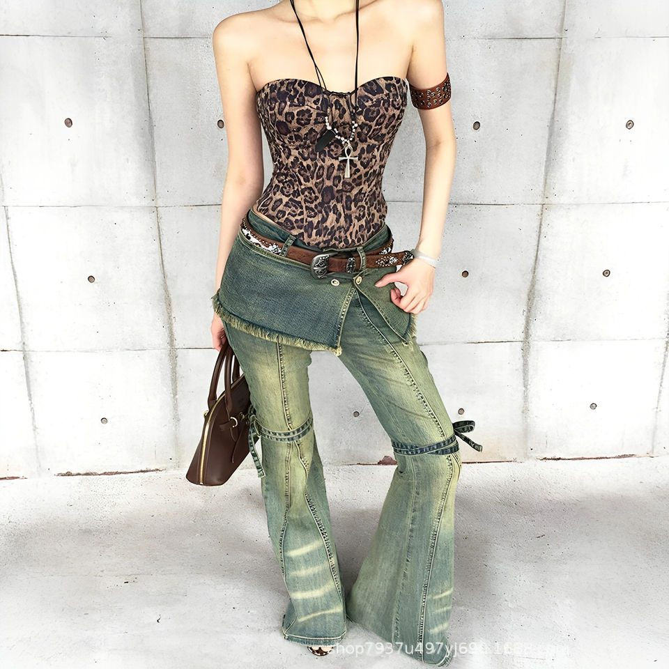 Pantalones Vaqueros Retro Personalizados con Alta Elasticidad y Cintura Baja, Lavados, Desgastados, Acampanados, Slim Fit, Estilo Falso Dos Piezas