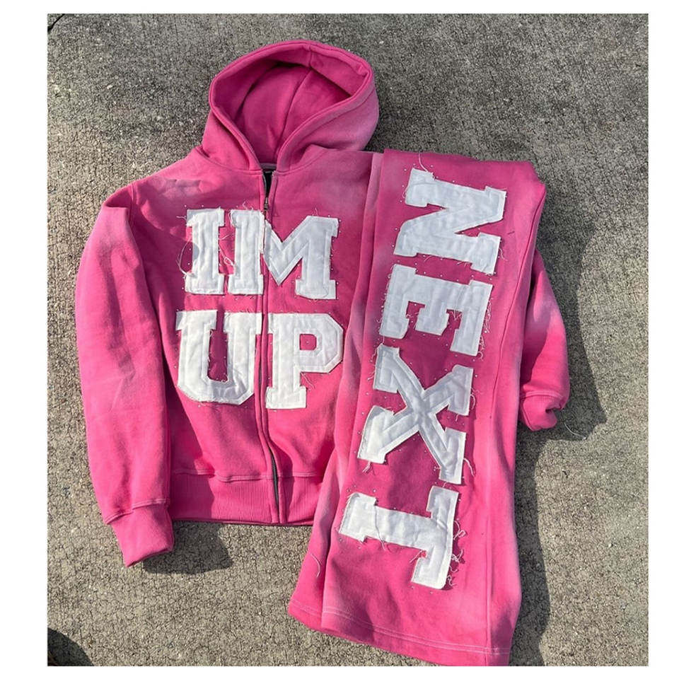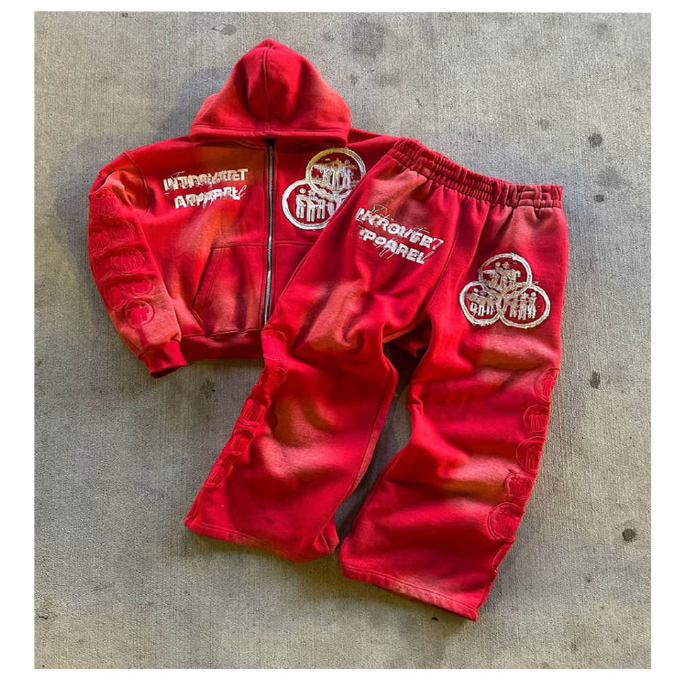 Conjunto de Sudadera con Capucha y Pantalones de Chándal con Cremallera, Estilo Desgastado, Parches y Lavado Ácido, de Moda, Casual, Estilo Urbano