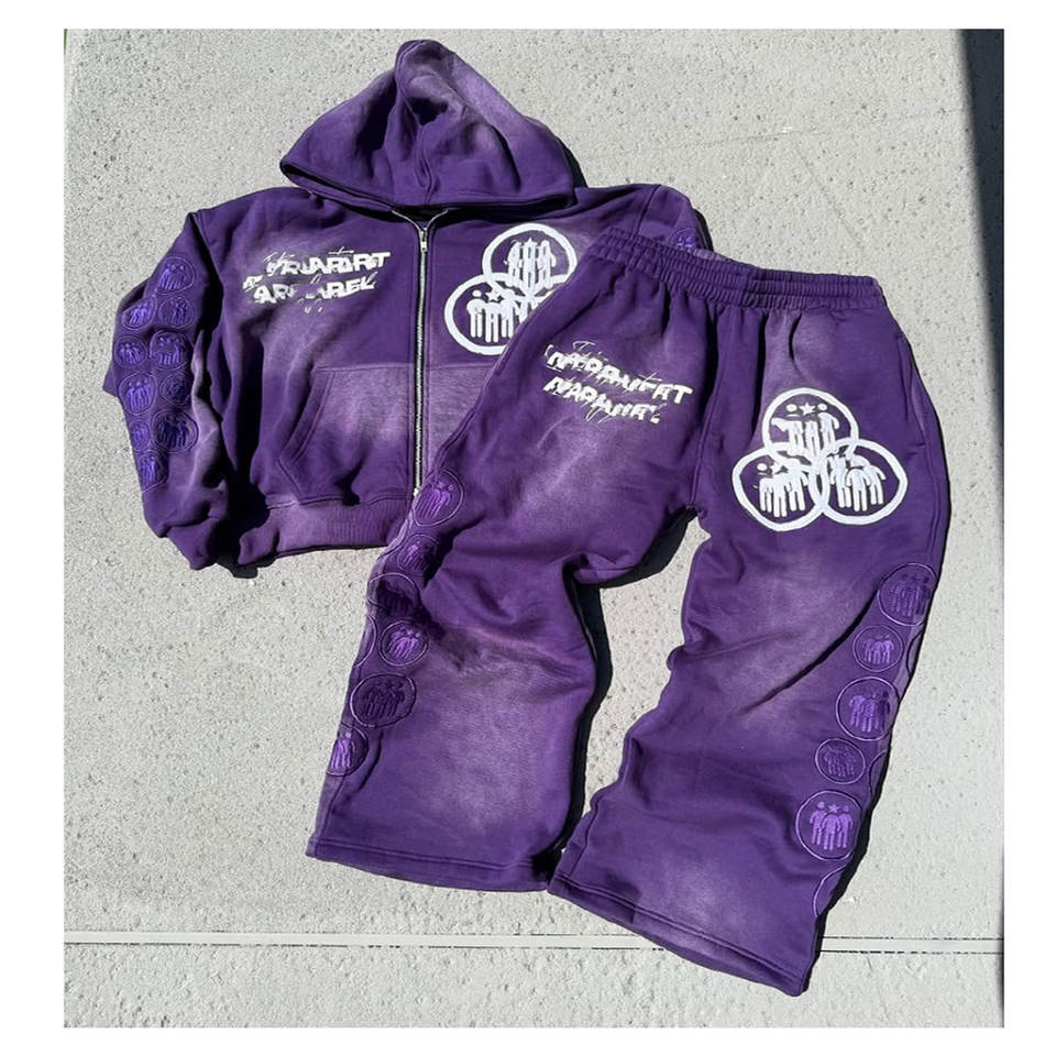 Conjunto de Sudadera con Capucha y Pantalones de Chándal con Cremallera, Estilo Desgastado, Parches y Lavado Ácido, de Moda, Casual, Estilo Urbano