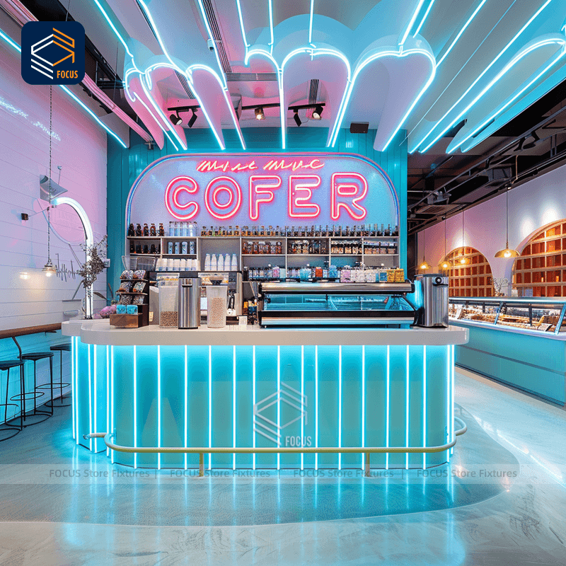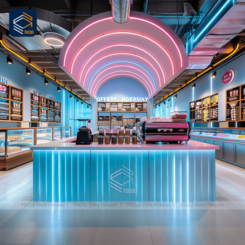 Diseño personalizado de heladería con vitrinas LED que cambian de color