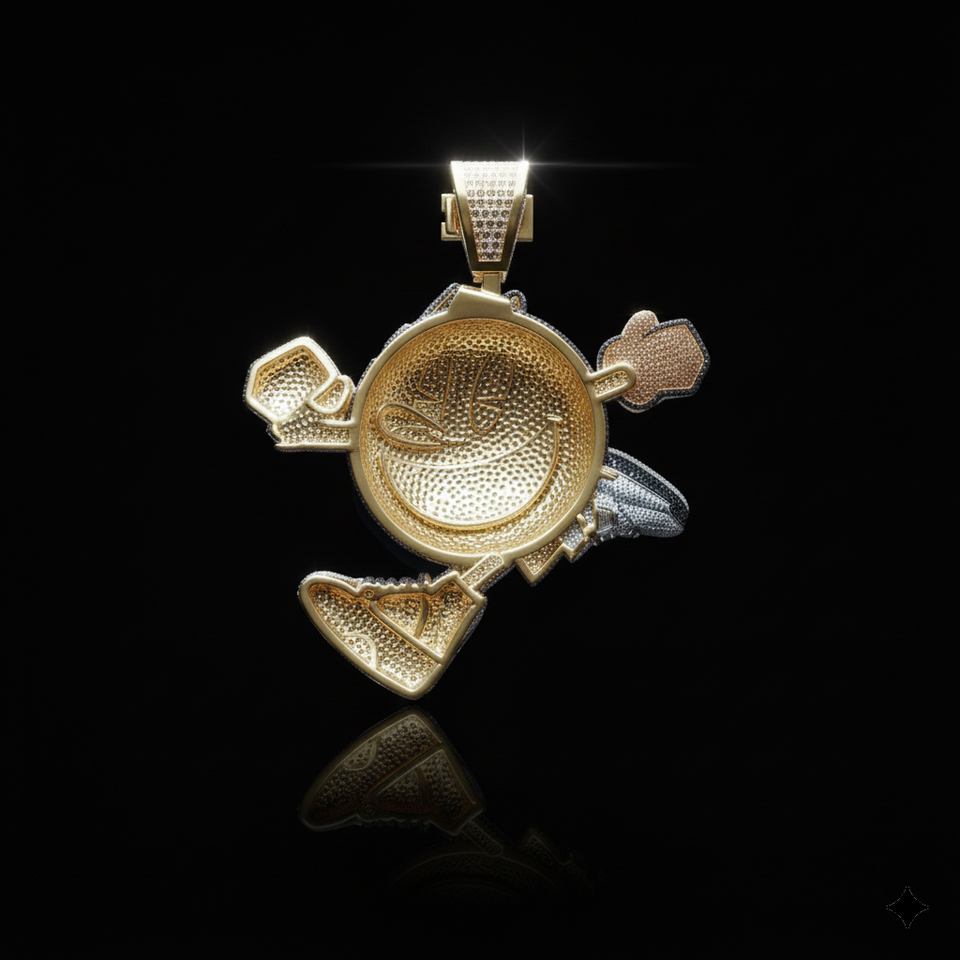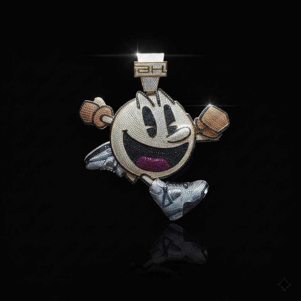 Colgante Personalizado con Personaje de Pac-Man, Diseñado a Mano en Oro Bicolor 925 con Micro Pavé de Diamantes y Diamante Negro