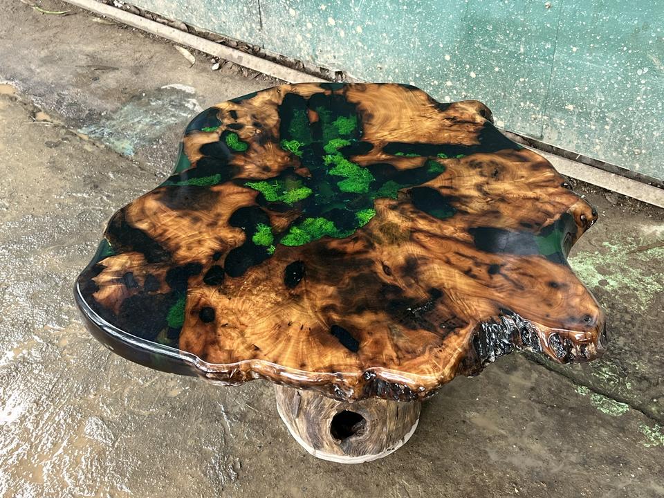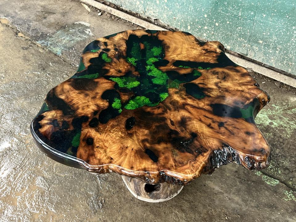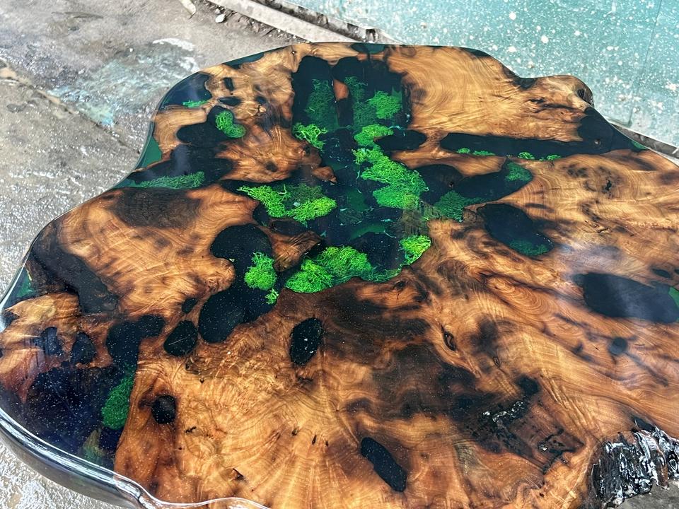 Mesa de centro de madera de resina epoxi con borde irregular personalizado y incrustaciones de musgo verde, mesa de río de madera maciza hecha a mano