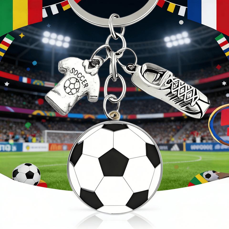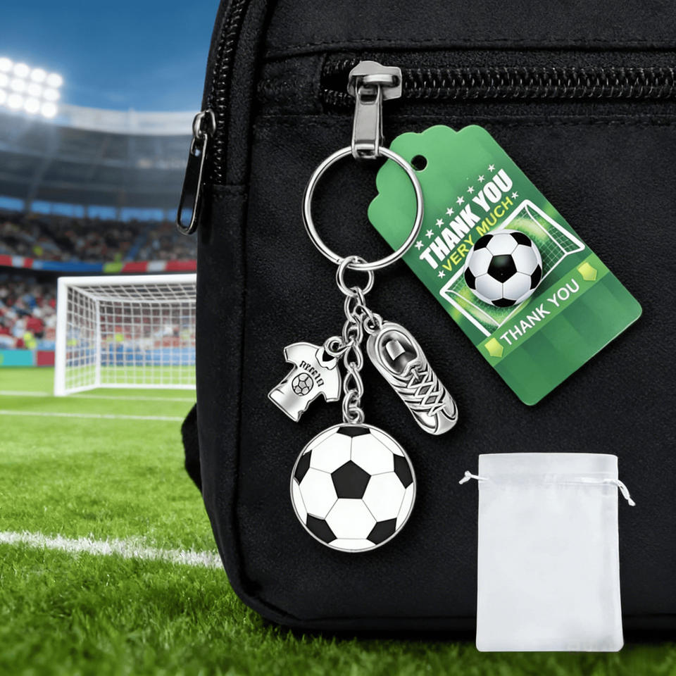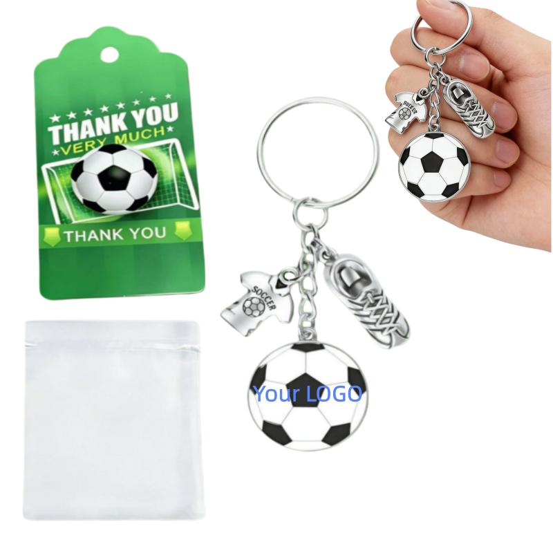 Juego de llaveros de fútbol de metal con LOGO personalizado, tarjeta de regalo y bolsa para amantes del fútbol, hombres, mujeres, jugadores de fútbol y aficionados.