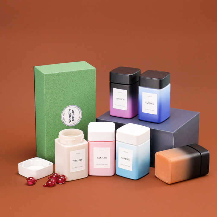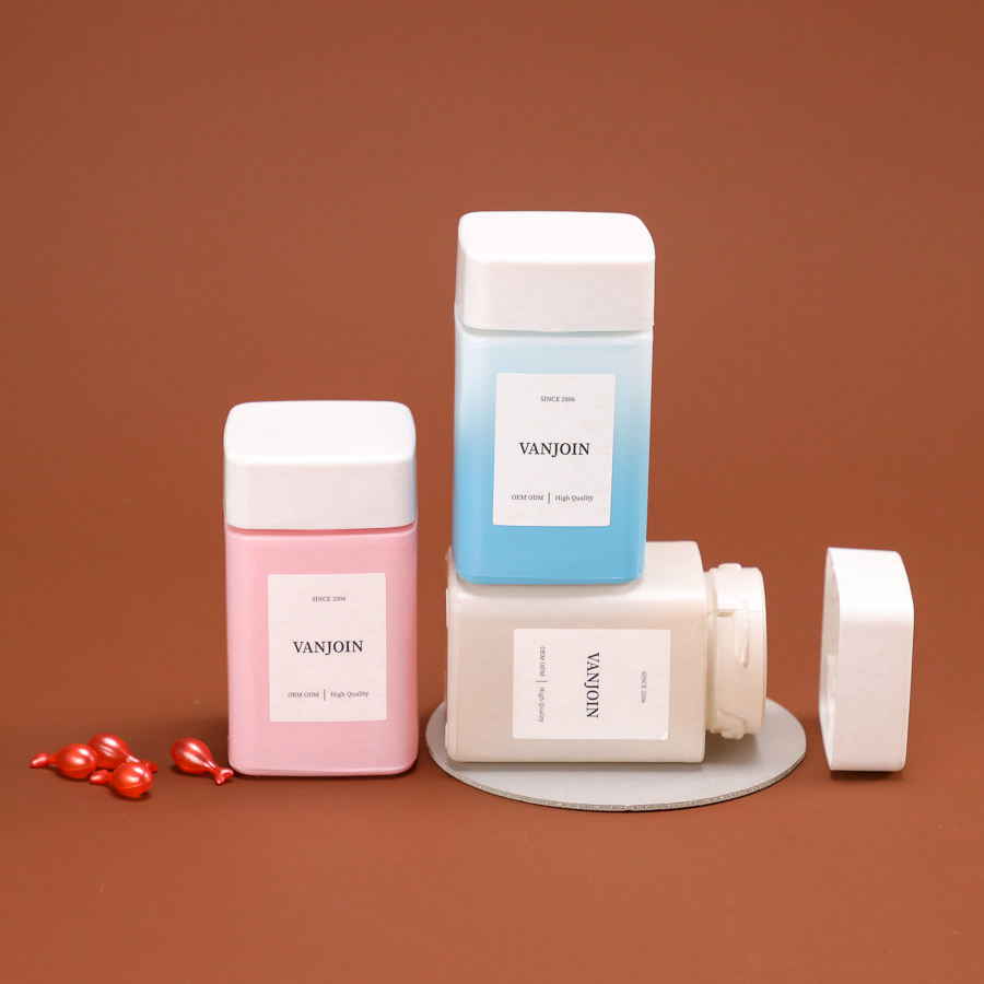 Etiqueta personalizada, botella de suplemento de Farmacia de vidrio cuadrado púrpura vacía, contenedor de cápsulas, tapón de rosca, tratamiento de superficie de serigrafía