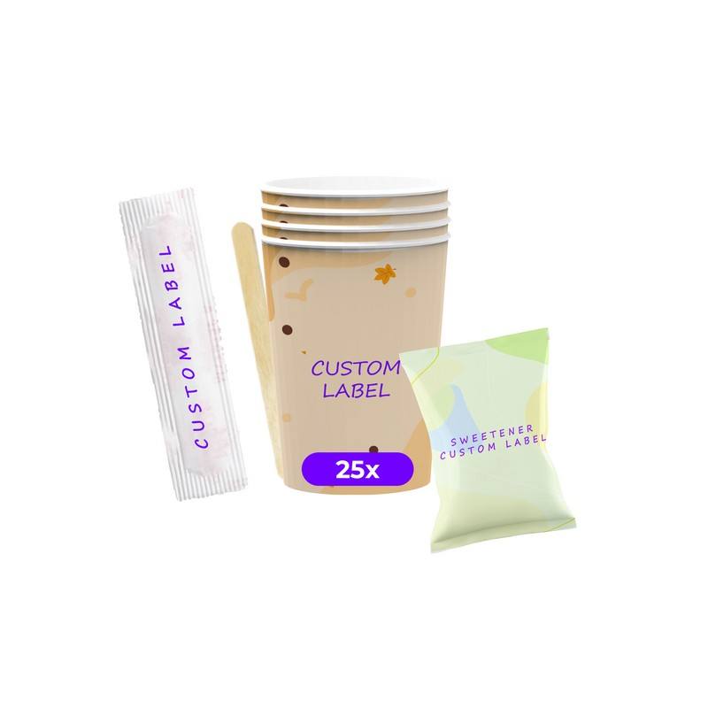Kit de etiquetas personalizadas Eco Natural compostable biodegradable vasos de papel + agitadores + edulcorante azúcar 25 uds bolsa logotipo personalizable
