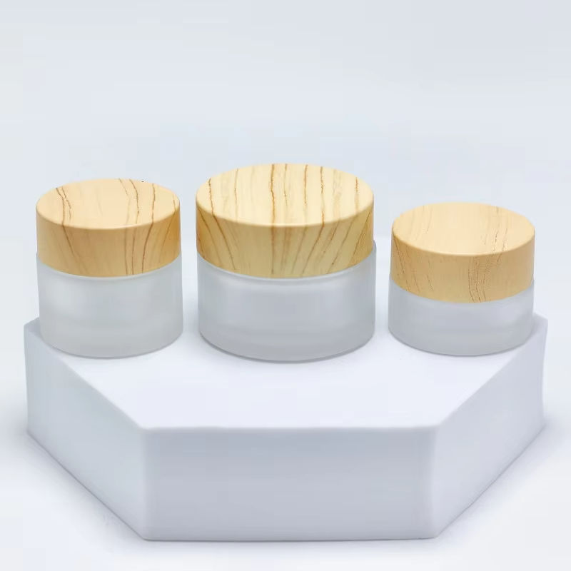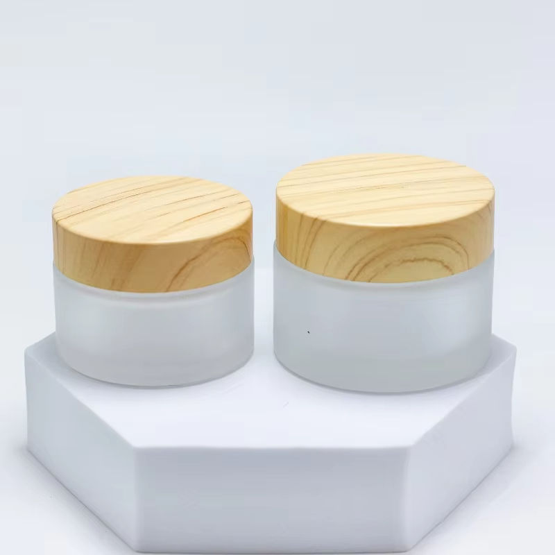 Envase Cosmético de Vidrio Esmerilado de 50g con Tapa de Color Madera, Frasco Redondo de Vidrio con Etiqueta Personalizada para Crema Cosmética
