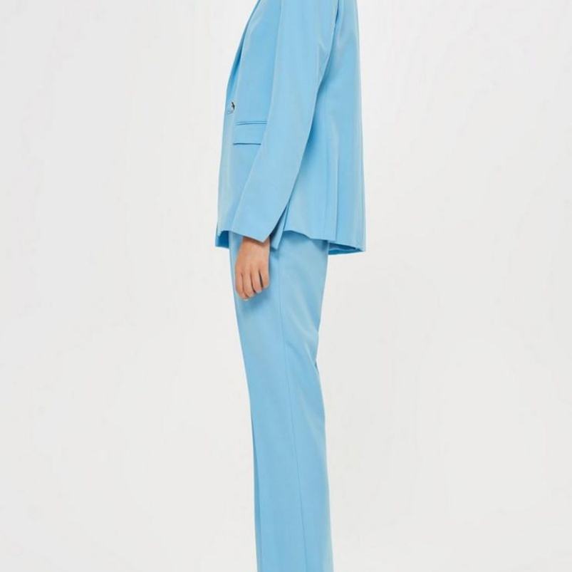 Pantalones azules hasta el tobillo con cierre de cremallera frontal y dobladillo acampanado inferior con bolsillos laterales personalizados para mujer