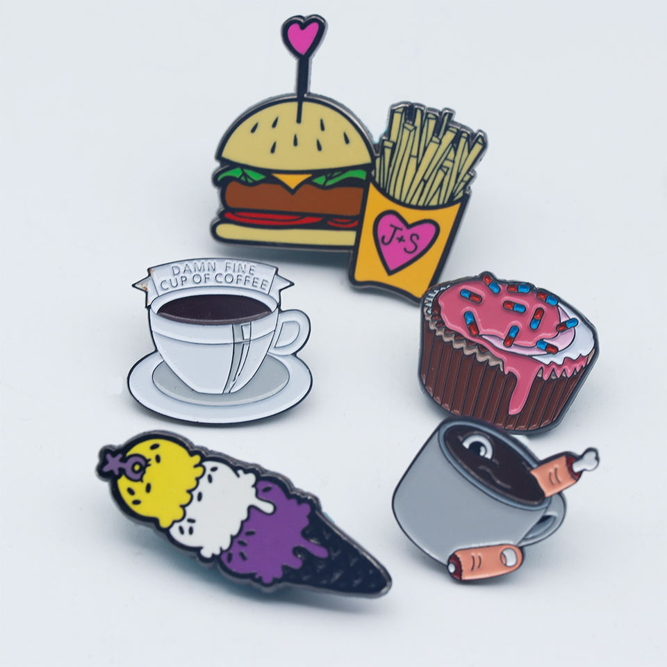 Alfileres de solapa esmaltados de Metal suave duro de comida de Anime de dibujos animados personalizados grandes para decoración de disfraces de sombreros
