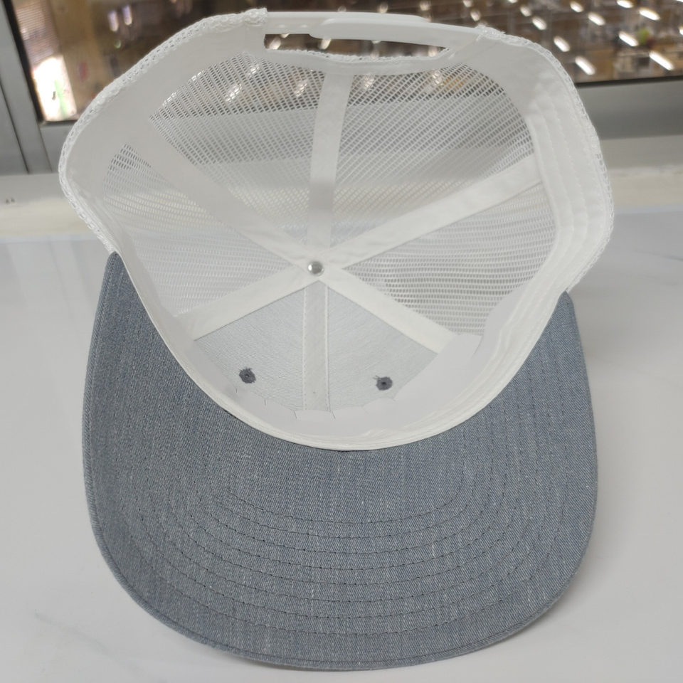 Parche con logotipo de cuero personalizado Ri 112 gorra de camionero OEM azul marino blanco malla y línea de costura en el ala 2 ojales para salidas de muchos estilos