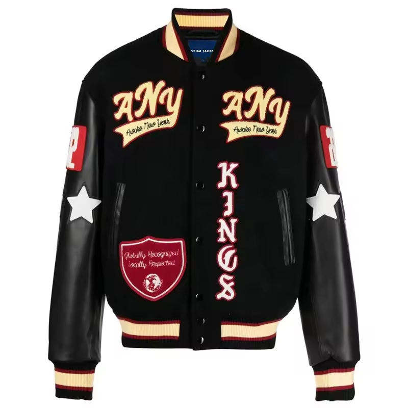 Chaqueta universitaria de manga de cuero personalizada con cuello Chenille bordado Bomber Baseball Letterman Varsity Jacket para hombres