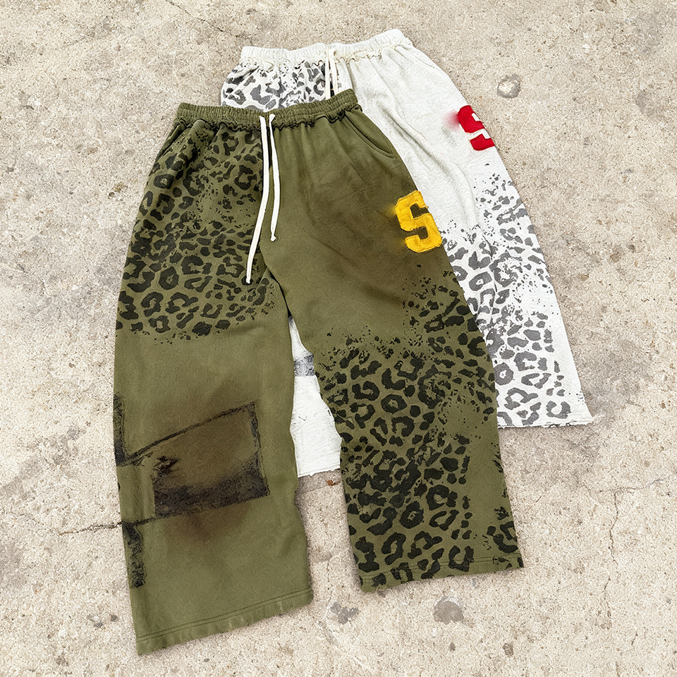 Pantalones de leopardo personalizados de gran tamaño desgastado lavado ácido recto pierna ancha pesado acampanado pantalones de chándal holgados fabricante
