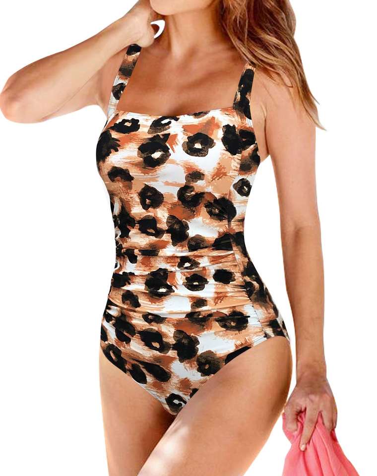 Traje de baño de una pieza con estampado de leopardo personalizado para mujer, traje de baño con cintura fruncida elástica de tela para playa, piscina o uso festivo
