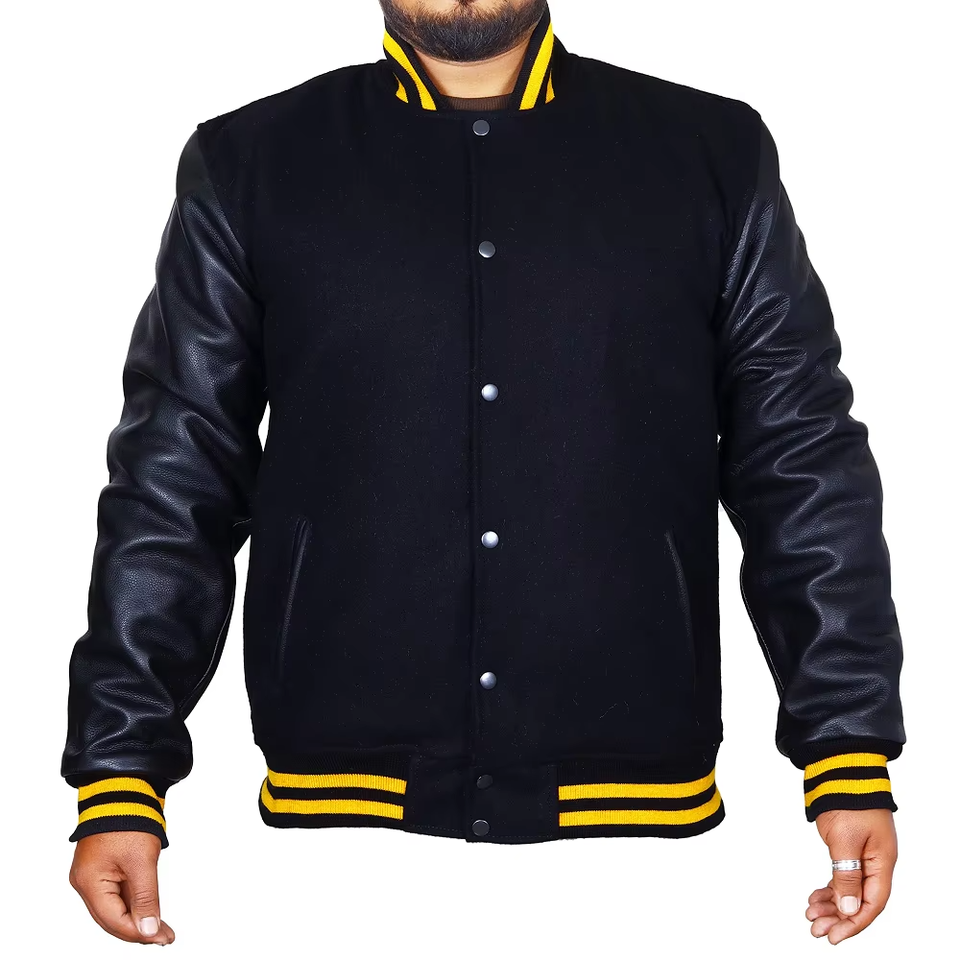Chaqueta Universitaria Personalizada con Mangas de Cuero Negro y Cuerpo de Lana, Chaquetas Americanas Juveniles con Bordado Chenille