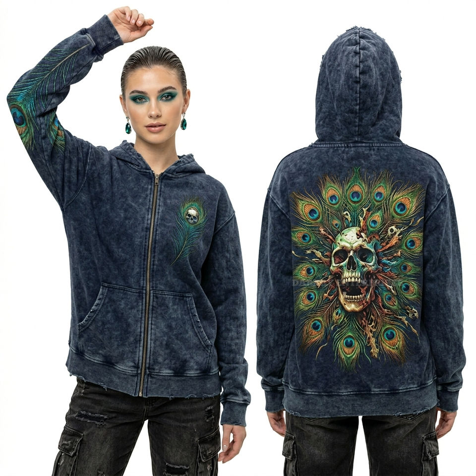Sudadera con capucha corta azul claro personalizada para mujer con gráfico de calavera y nubes, estampado de estrellas desgastado en las mangas, fabricante