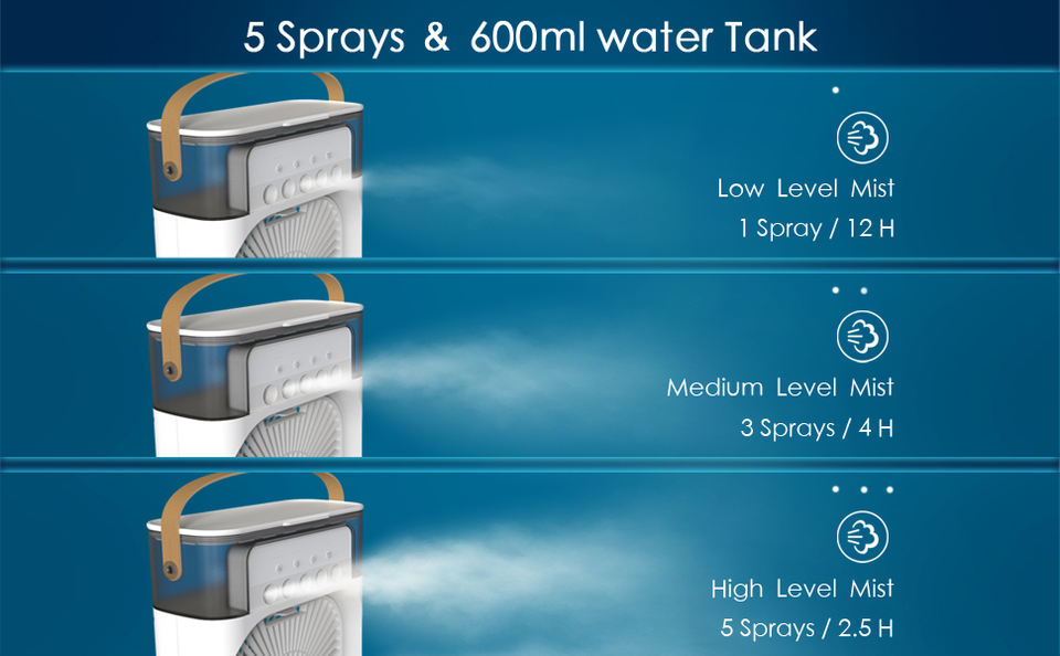 Humidificador portátil 3 en 1 con logotipo personalizado, ventilador enfriador de aire acondicionado, luz LED de 7 colores, 3 velocidades para uso en GARAJE DE Hotel, USB Solar DC