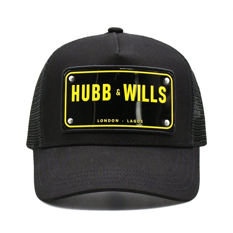 Gorra Trucker de 5 Paneles con Logotipo Personalizado, Algodón Negro con Malla y Placa Metálica, Unisex para Viajes