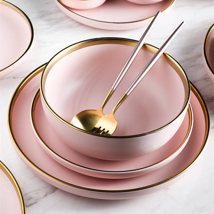 Plato redondo mate de cerámica al por mayor de estilo nórdico con logotipo personalizado de 7/8/9/10 pulgadas con borde dorado en el interior para restaurante